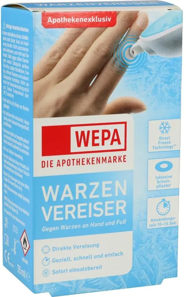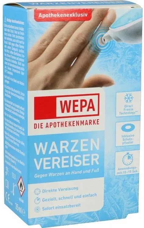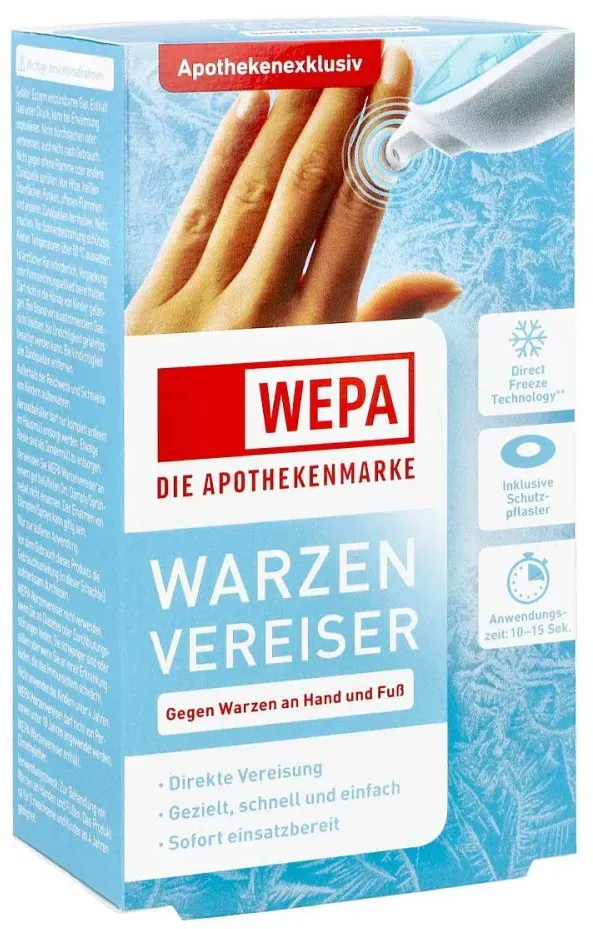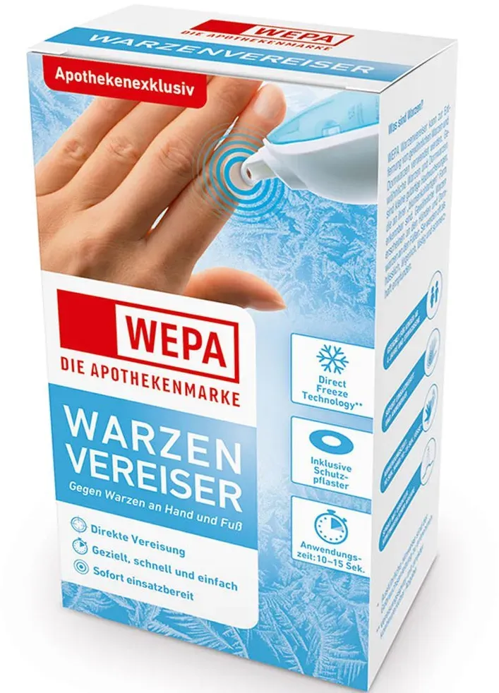 11,07 /Stück - Kategorie: Arzneimittel - Wepa - GTIN:4150153876024 - PZN:15387602 - Anwendungsgebiet von Wepa WarzenvereiserWepa Warzenvereiser kann zur Entfernung von gewöhnlichen Warzen und Dornwarzen verwendet werden. Die Warze kann bis zum Kern mit einem präzisen Sprühstrom von Kältegas vereist werden. Nach der Behandlung fällt die Warze in der Regel innerhalb von 10-14 Tagen ab. Bei hartnäckigen Warzen muss die Behandlung mit Wepa Warzenvereiser eventuell wiederholt werden. Wirkstoffe / Inhaltsstoffe / Zutaten Inhaltsstoffe von Wepa Warzenvereiser : DimethyletherGegenanzeigenBei bekannter überempfindlichkeit gegen einzelne Inhaltsstoffe sollte Wepa Warzenvereiser nicht angewendet werden.DosierungAnwendungsempfehlung von Wepa Warzenvereiser: 1. Vorrichtung auf die Warze halten. Darauf achten, dass die Düse fest auf der umliegenden Haut anliegt. 2. Mit dem Daumen langsam auf den Behälter drücken. Warze ununterbrochen für die angemessene Behandlungsdauer (10 oder 15 Sekunden***) besprühen. *** Ausführliche Hinweise sind der Gebrauchsanleitung zu entnehmen. Wepa Warzenvereiser können in Ihrer Versandapotheke www.apolux.de erworben werden. - 11,07 Euro bei apolux.de - gefunden von billiger.de juvalis.de Wepa Warzenvereiser
