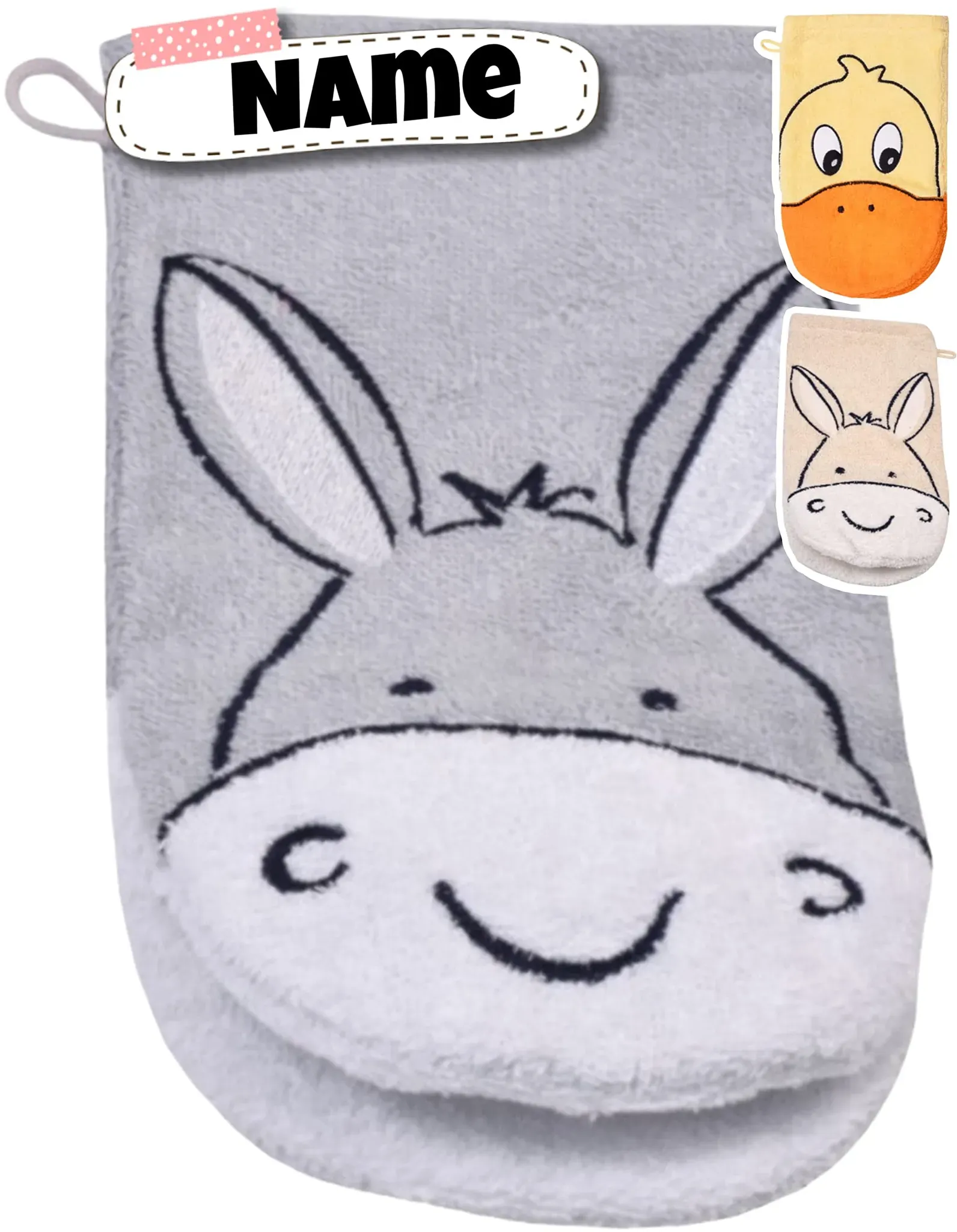 Gewöhnlich versandfertig in 3 bis 4 TagenStickling Baby Waschhandschuh personalisiert | Waschlappen Kinder mit Namen bestickt | 100% Baumwolle | Frottee | Baby Geschenke (Esel Hellgrau)