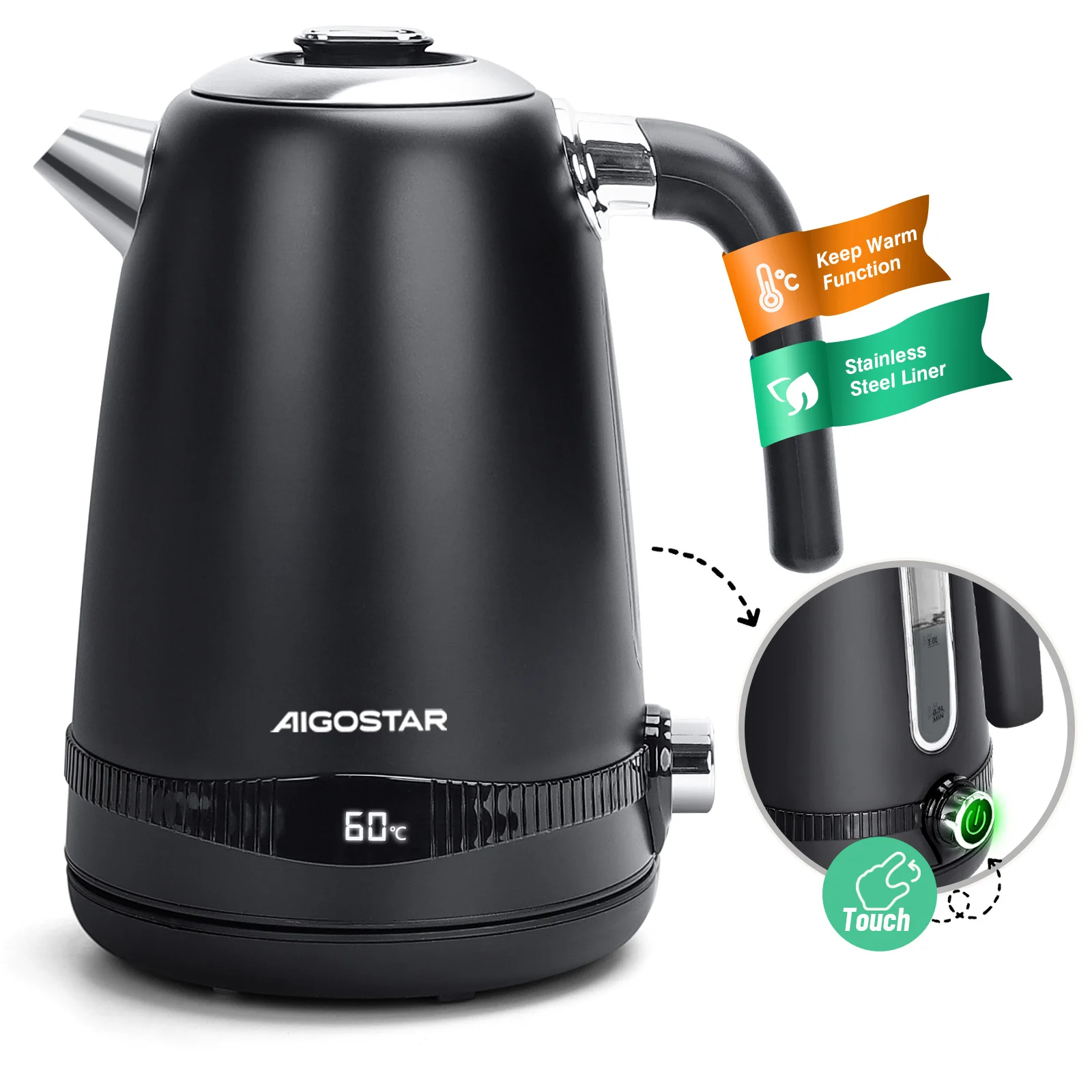 Zustand: Neu - Wasserkocher - ecosa Ecosa - 691er 692 - EAN: 4260677794268 - œ”ï¸Unser hochwertiger Wasserkocher ist die perfekte Kombination aus modernem Design, Benutzerfreundlichkeit und Funktionalität und eignet sich ideal für jeden Haushalt. Dieser Wasserkocher bietet eine Kapazität von 1,7 Litern und ist sowohl leistungsstark als auch sicher dank seiner durchdachten Ausstattung und intuitiven Bedienung. œ”ï¸Hochwertige Materialien und durchdachtes Design Der Innenraum des Wasserkochers besteht aus langlebigem 304 Edelstahl, was höchste Hygiene und Geschmacksneutralität rt. Die Außenseite ist aus hitzebeständigem PP (Polypropylen) gefertigt, welches einen Cool-Touch-Effekt bietet, sodass der Wasserkocher auch während des Erhitzens sicher angefasst werden kann. œ”ï¸Intelligente Temperatureinstellungen für vielseitige Einsatzmöglichkeiten Der Wasserkocher verfügt über fünf einstellbare Temperaturstufen, die sich auf dem attraktiven großen Digitaldisplay auswählen œ”ï¸40°C - Perfekt für die Zubereitung von Milch, ideal für Babynahrung und Milchgetränke. 70°C - Die ideale Temperatur für die Zubereitung von Honigwasser, um die wertvollen Inhaltsstoffe des Honigs zu bewahren. 80°C - Optimale Temperatur für Grüntee, um das volle Aroma zu entfalten und die Blätter nicht zu verbrennen. œ”ï¸90°C - Perfekt für Kaffeespezialitäten, wie z.B. löslichen Kaffee oder French Press. 100°C - Kochendes Wasser für Schwarztee, Kräutertees und alle weiteren Anwendungen, die eine volle ... Der Aigostar Retro Wasserkocher überzeugt mit digitaler Temperaturanzeige, Warmhaltefunktion und einem stilvollen mattschwarzen Design. ![]() Aigostar Edelstahl Wasserkocher mit Temperatureinstellung 1,7 Liter Retro Schwarz Matt - Digitaler Temperaturanzeige Elektrisch Wasserkocher 2200W, Warmhaltefunktion, Ohne Plastik Inner, BPA-frei
