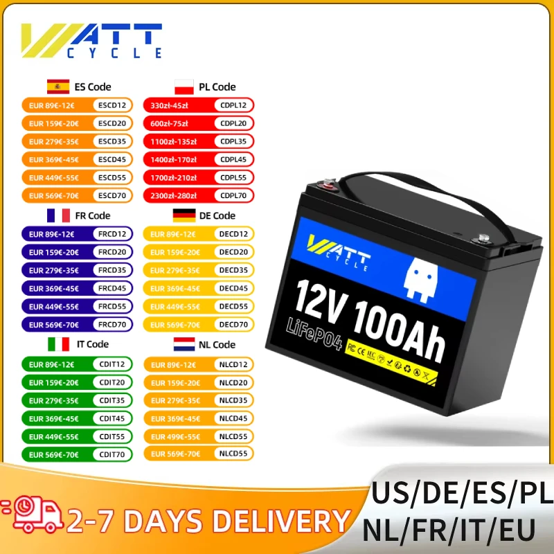 Wattcycle - Wattcycle 12V 100AH LiFePO4 Lithiumbatterie 5000+ Zyklen Eingebautes 100A BMS Perfekt für Trolling-Motor, Wohnmobile, Transporter, Fischfinder - bei de.aliexpress.com - aus Yadore Produktdaten Ein weiteres sehr preiswertes Angebot mit hoher Zyklenzahl und 10 Jahren Lebensdauer, ideal für Camping und Heim-Energiespeicher. ![]() ![]() WattCycle LiFePO4 100Ah 12V Lithium Batterie mit Bis Zu 15000 Zyklen, Schutz gegen Niedrige Temperaturen, 10 Jahre Lebensdauer, 1280Wh Lithium Solarbatterie für Wohnmobil, Camping,Heim-Energiespeiche