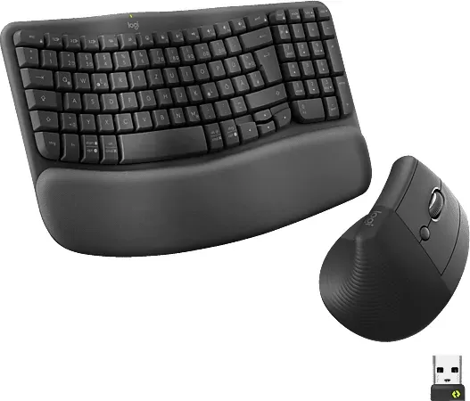 Logitech - EAN: 5099206132764 - Logitech Wave Keys and Lift Combo - Tastatur-und-Maus-Set - kabellos - Bluetooth LE, 2.4 GHz - QWERTZ - Deutsch - GraphiteLogitech Wave Keys und Lift vertikale Maus Ergonomisches kabelloses Set aus Tastatur und Maus mit gepolsterter Handballenauflage, Easy-Switch, Bluetooth, Multi-OS, Windows/Mac.Feel the Wave, Feel the LiftNoch mehr Komfort mit Wave Keys und Lift, entwickelt für weniger Druck und eine bessere Haltung von Handgelenk und Unterarm am Schreibtisch. Passt perfekt für kleine bis mittelgroße HändeGeprüft von Ergonomie-ExpertenEntworfen, entwickelt und getestet mit dem Logi Ergo Lab und von United States Ergonomics empfohlen: Damit können Sie sicher sein, dass Wave Keys und Lift es ernst meinen, wenn es um Ihr Wohlbefinden am Arbeitsplatz gehtKompakte Tasten mit allem, was Sie brauchenDie kompakte Form der Wave Keys Tastatur ermöglicht es Ihnen, die Lift Maus näher an Ihrem Körper zu platzieren und Ihre Schulter beim Arbeiten in eine bequemere, natürlichere Position zu bringen. (Kunststoffanteil bei Maus und Tastatur: mindestens 46 % recycelter Kunststoff. Ausgenommen Kunststoff in Leiterplatten Baugruppe, Empfänger, Batterie sowie Verpackung)Spüren Sie, wie der Druck nachlässtMehr als nur eine gepolsterte Handballenauflage. Drei Schichten mit unterschiedlichen Eigenschaften wirken zusammen, um Ihre Handgelenke zu stützen und Ihnen Komfort zu bieten, wie Sie es brauchenHeben Sie die Hand mit KomfortDank der natürlichen Handhaltung ... ![]() ![]() Logitech Wave Keys and Lift Combo - Tastatur & Maus Set - Englisch (US) - Schwarz