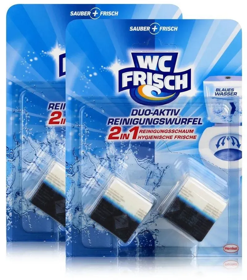 Zustand: Neu - 1,80 € / stück - WC-Reiniger - WC-Frisch WC Frisch - WCW12 - EAN: 4015000959742 - Reinigung und frischer Duft - Die WC FRISCH Duo-Aktiv WC Steine für den Spülkasten bieten langanhaltende Frische und Sauberkeit in der Toilettenschüssel 2in1 Wirkstoff-Kombination - Dank der 2in1 Wirkung sorgt der Toilettenreiniger für einen intensiven Reinigungsschaum und einen frischen Duft in der Toilette Sichtbare Reinigung - Kalk- und Schmutzablagerungen wird dank der Wirkung von Zitronensäure vorgebeugt und der WC Reiniger verleiht dem Spülwasser eine frisch-blaue Farbe für ein sichtbares Reinigungserlebnis Ergiebige Formel - WC FRISCH Duo-Aktiv Reinigungswürfel bieten hygienische Frische und Sauberkeit für bis zu 800 Spülungen - Toilettenreinigung mit jeder Spülung Einfache Handhabung - Die WC Reinigung ist ganz einfach: Dazu den WC FRISCH Reinigungswürfel mit der Folie in den Wasserkasten auf die gegenüberliegende Seite vom Wassereinlauf werfen Hinweis: Die Abbildungen können leichte Abweichungen zu dem gelieferten Artikel aufweisen - Verkäufer: Bürowelt-Blank im amazon.de Marketplace Dieses 2er-Pack ist eine gute Option für den regelmäÃ?igen Gebrauch und bietet ein gutes Preis-Leistungs-Verhältnis. ![]() WC FRISCH 2er-Pack WC-Reinigungswürfel »Duo-Aktiv Ozeanfrische« blau