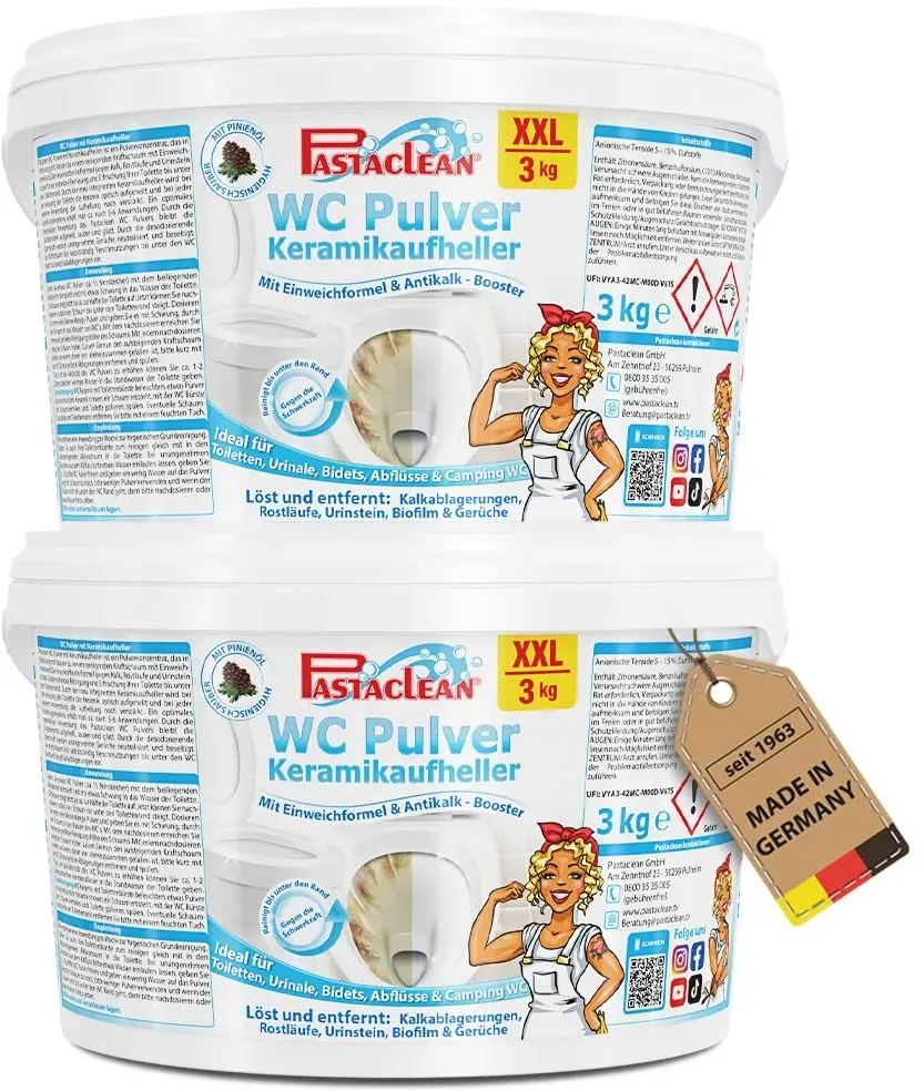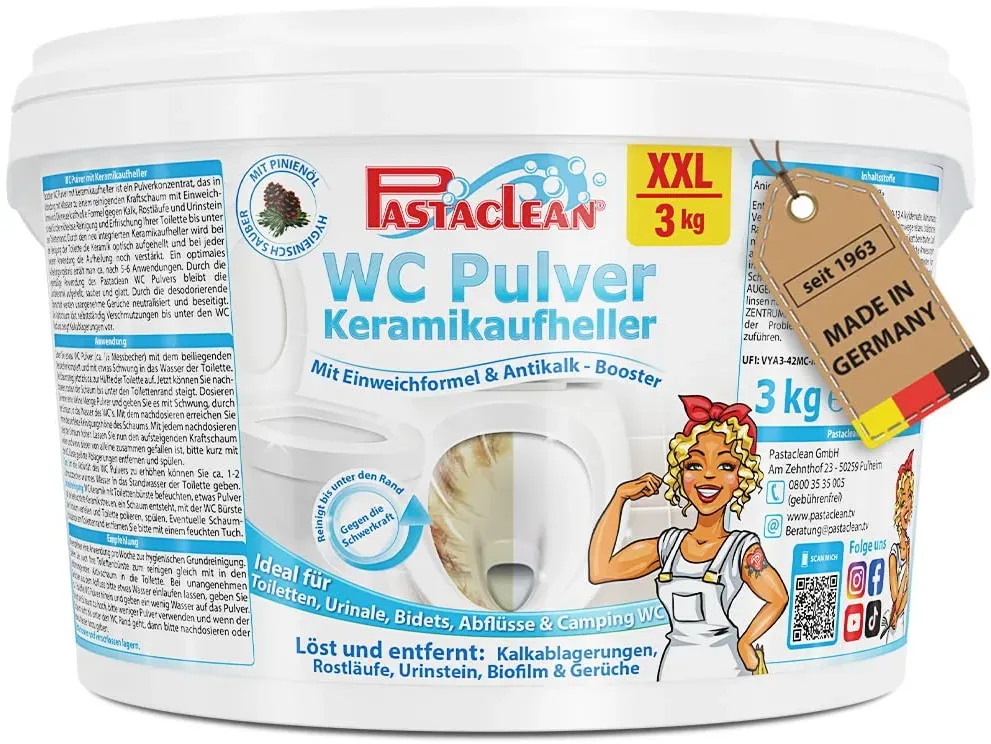 Zustand: Neu - 12,00 € / kg - WC-Reiniger - HiGloss - 5001904000000037 - EAN: 4067844260867 - Einzigartige Schmutzfinder-Technologie: HiGloss WC Zauberpulver erkennt und entfernt hartnäckige Verschmutzungen effektiv und gründlich, selbst in schwer zugänglichen Bereichen. Frischer Duft: Genießen Sie nach jeder Anwendung einen angenehmen und langen Frischeduft in Ihrem Badezimmer, der unangenehme Gerüche neutralisiert und für frischen Wind sorgt. Einfache Anwendung: Dank der innovativen Formel ist keine mechanische Reinigung erforderlich. Das Pulver einfach ins WC geben, einwirken lassen und mit Wasser nachspülen. Umweltfreundlich und sicher: Die spezielle Sauerstoff-Aktivschaum-Formel reinigt hygienisch ohne aggressive Chemikalien. Sicher für Ihre Familie und die Umwelt. 2,5kg Vorratspackung: Der große Vorrat reicht für viele Anwendungen und spart Zeit und Mühe. Perfekt für Haushalte, die regelmäßig eine gründliche WC-Reinigung benötigen. - Verkäufer: CHANNEL21 im amazon.de Marketplace Ein großes Gebinde mit Keramikaufheller und Pinienöl, das extra stark gegen Kalk und Urinstein ist. ![]() ![]() Pastaclean WC Pulver (3kg) mit Keramikaufheller & Pinienöl I WC Reiniger Schaum I EXTRA STARK gegen Kalk- & Urinstein I Reinigt bis unter den Rand der Toilette