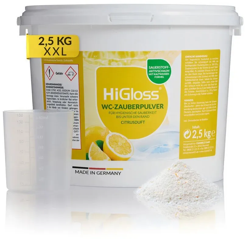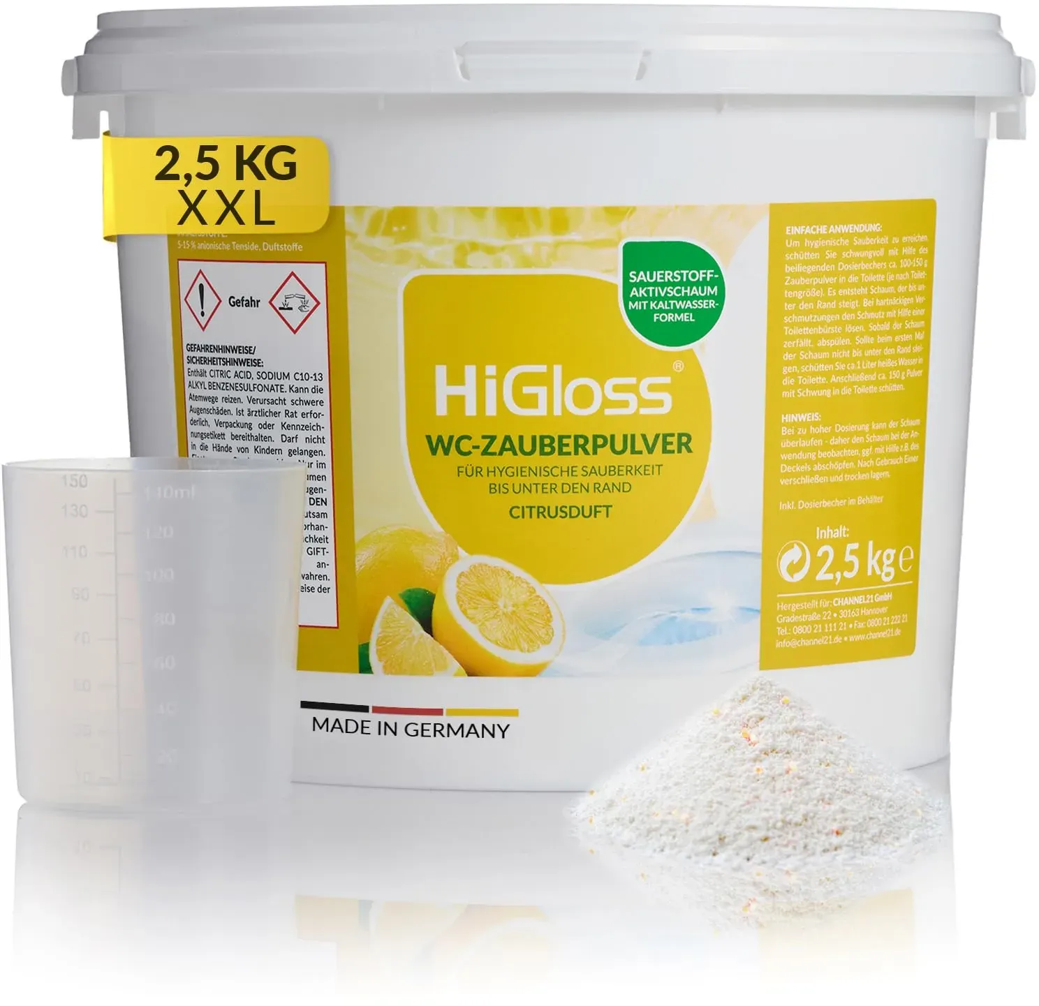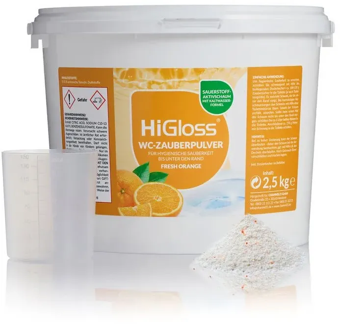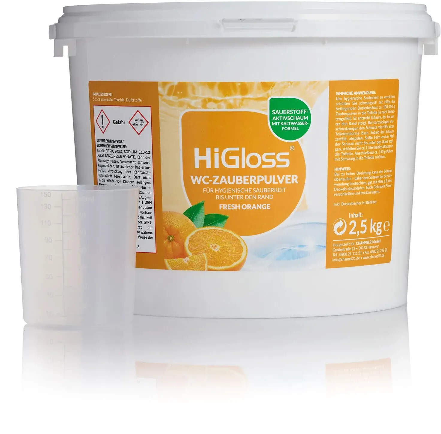 Auf Lager Versand durch AmazonHiGloss WC Zauberpulver 2,5Kg Schmutzfinder-Technologie, WC Schaum extra stark geg. Urinstein & Kalk (Fresh Orange)