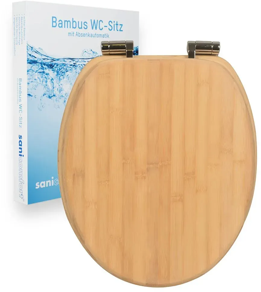 Kategorie: WC-Sitze - Sanicomfort - GTIN:4002071282244 - Natürlich & nachhaltig WC-Sitz aus echtem Bambus mit Absenkautomatik Hochwertiger WC-Deckel aus massivem Bambus mit Soft-Close-Funktion schließt sanft und geräuschlos. Ideal für Familien, Senioren und nächtliches Toilettengehen.Universell passend & formschön Oval & belastbar bis 150 kg Der ovale Toilettensitz passt auf die meisten Standard-Toiletten. Massivholz-Konstruktion ist besonders belastbar, langlebig und widerstandsfähig bis 150 kg.Stabile Edelstahl-Scharniere kein Wackeln, kein Rost Edelstahl-Scharniere mit Anti-Rutsch-Technologie für festen Halt. Korrosionsfrei, hygienisch und ideal für feuchte Badezimmerumgebungen.Antibakteriell & leicht zu reinigen Bambus mit Schutzlack Die glatte Oberfläche ist pflegeleicht, antibakteriell und hygienisch. Der WC-Sitz in Holzoptik bringt natürliche Wärme ins Bad.Einfache Montage mit komplettem Montageset Der WC-Sitz wird mit allem geliefert, was Sie zur Montage benötigen. Werkzeugfreundlich und schnell montiert für sofortigen Einsatz. Farben werden individuell sehr unterschiedlich wahrgenommen, die Darstellung variiert zudem je nach genutzter Computerhardware. Farbabweichungen zwischen Abbildung und realem Artikel sind deshalb unvermeidlich. Da es sich um ein Naturprodukt handelt, kann es bei der Verarbeitung zu farblichen Abweichungen zwischen den einzelnen Chargen kommen. Diese Unterschiede entstehen durch die jeweilige Sorte und Beschaffenheit des Bambus. - 34,99 Euro ... Dieser CASARIA WC-Sitz aus Duroplast für 36.95 Euro bietet eine robuste und langlebige Option mit Bambus-Design. ![]() ![]() CASARIA WC-Sitz Duroplast Bambus