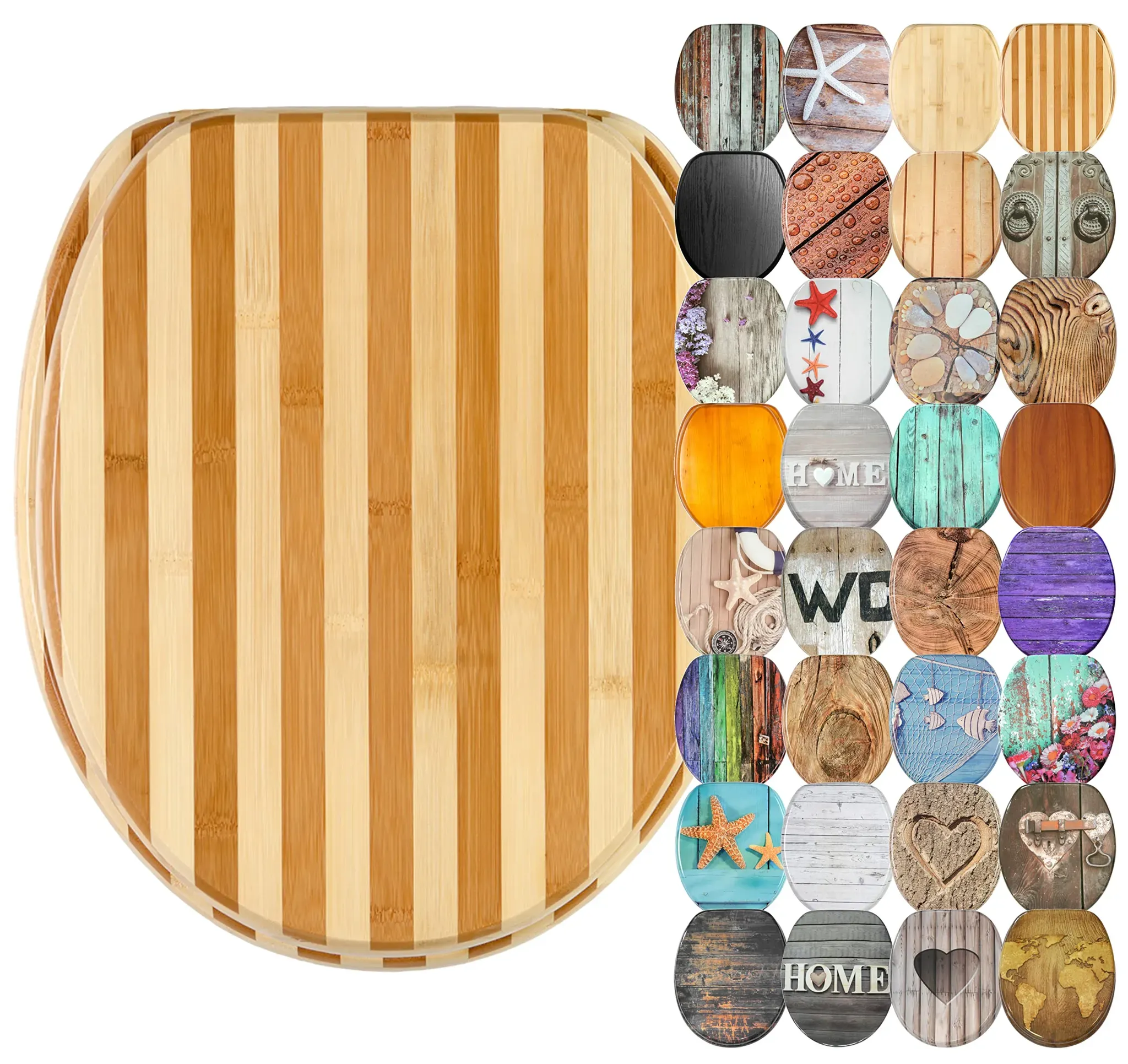 Kategorie: WC-Sitze - Sanilo - GTIN:0646437213288 - Hochwertig Der WC Sitz besteht aus stabilem und bruchfestem Holz. Dank der speziellen Verarbeitung und des hochwertigen Materials bietet der Deckel einen sehr bequemen Sitzkomfort Praktisch Die integrierte Absenkautomatik schließt den WC-Deckel sanft und leise. So wird die Oberfläche des Toilettensitzes geschont und die Langlebigkeit des Produktes erhöht Universell Durch die Form des Toiletten-Deckels passt er auf alle handelsüblichen Hänge- und Steh WC-Becken und kann mithilfe des mitgelieferten Montagematerials leicht befestigt werden Stylisch Der WC-Sitz ist in verschiedenen, kreativen Motiven erhältlich und eignet sich ideal dazu, das Badezimmer an die eigenen Wünsche anzupassen und es individuell zu gestalten Pflegeleicht Die Toiletten-Brille verfügt über eine spezielle antibakterielle Oberfläche und kann problemlos mit allen Haushaltsreinigern gereinigt werden - 49,99 Euro bei Amazon Marketplace Home Improvement - gefunden von billiger.de Dieser WC-Sitz bietet eine gestreifte Bambus-Optik und Absenkautomatik direkt vom Hersteller. Wcshop24.d e