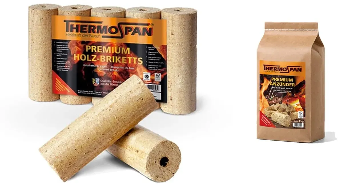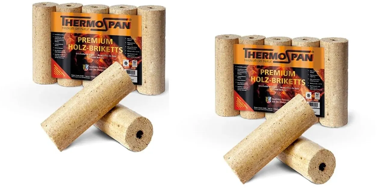 Kategorie: Brennstoffe - Sanitärshop Baustoffe & Sanitär - Premium Holzbriketts ohne Verwendung von Bindemitteln und Zusatzstoffen zur Befeuerung von Kamin Heizung oder Grill Optimierte Rundform mit Loch Hoher Heizwert: 4,9 kWh/kg Restfeuchte: 10% Aschegehalt: 0,5% - 16,99 Euro bei Amazon Marketplace Home - gefunden von billiger.de ![]() ![]() Sanitärshop Baustoffe & Sanitär zbs24 Premium Holzbbriketts 10 kg - Thermospan Weichholzbriketts mit optimierter Rundform mit Loch - zum Heizen für Kamin Grill Heizung - inkl. 1 kg Anzünder Premium