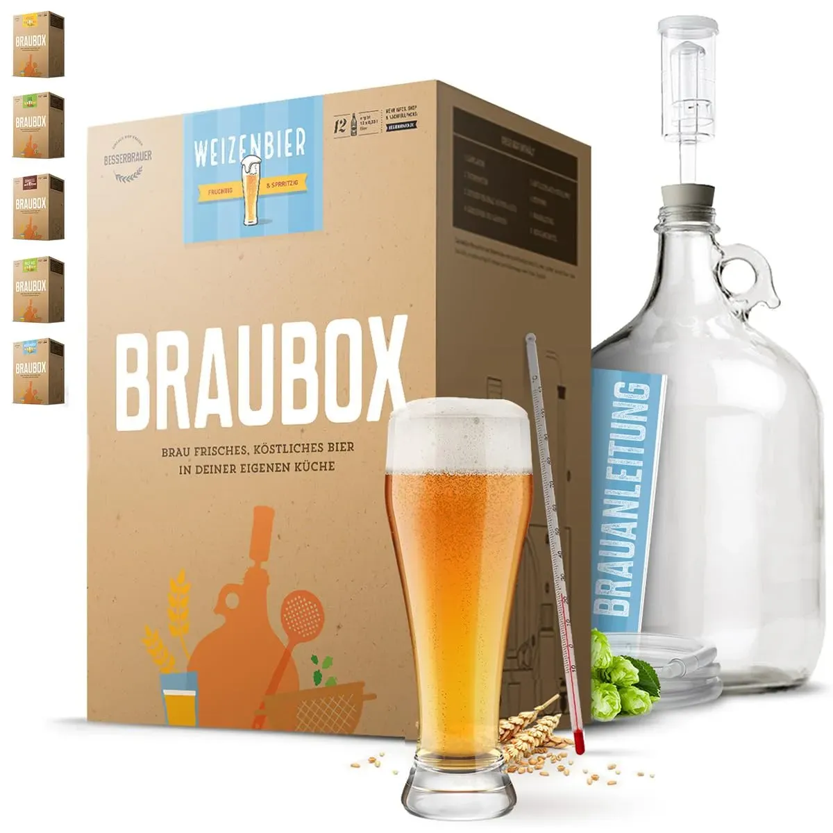 Zustand: Neu - Heimbrau-Sets - Braubox Besserbrauer - - EAN: 4260512370060 - 🺠TESTSIEGER und bewertet mit Sehr gut im Bierbrauset-Test von BILD.de, das AM HÖCHSTEN BEWERTETE Brauset auf Amazon 🺠MACH DEINE KÜCHE ZUR MINI-BRAUEREI: Braue bestes Bier am eigenen Herd! Statt riesigen Braugeräten enthält das Set eine wiederverwendbare 5-Liter-Gärflasche und handliche Utensilien im Küchenformat 🺠BESTE ROHSTOFFE, KEINE EXTRAKTE: Vergiss Malzsirup und Hopfenextrakte! Wer bestes eigenes Bier brauen will, greift zu echtem Braumalz und Hopfen. Unser Malz wird direkt nach dem Schroten luftdicht verpackt, damit es so frisch wie möglich bei Dir ankommt! 🺠AUSFÜHRLICHE BRAUANLEITUNG: Maischen, läutern, Hopfen kochen, gären, reifen: Unsere Brauanleitung ist bebildert, verständlich und enthält viele Tipps und Hintergrundwissen! 🺠WIEDERVERWENDBAR: Die Geräte aus der Braubox sind selbstverständlich wiederverwendbar. Nach dem ersten eigenen Bier benötigst Du lediglich eines unserer Nachfüllpakete oder experimentierst mit einem eigenen Brau-Rezept. - Verkäufer: besserbrauer im amazon.de Marketplace ![]() ![]() Braubox , Sorte Weizenbier | Bierbrauset für die Küche | mit 5-Liter-Gärflasche | wiederverwendbar | Erfolgsgarantie von Besserbrauer
