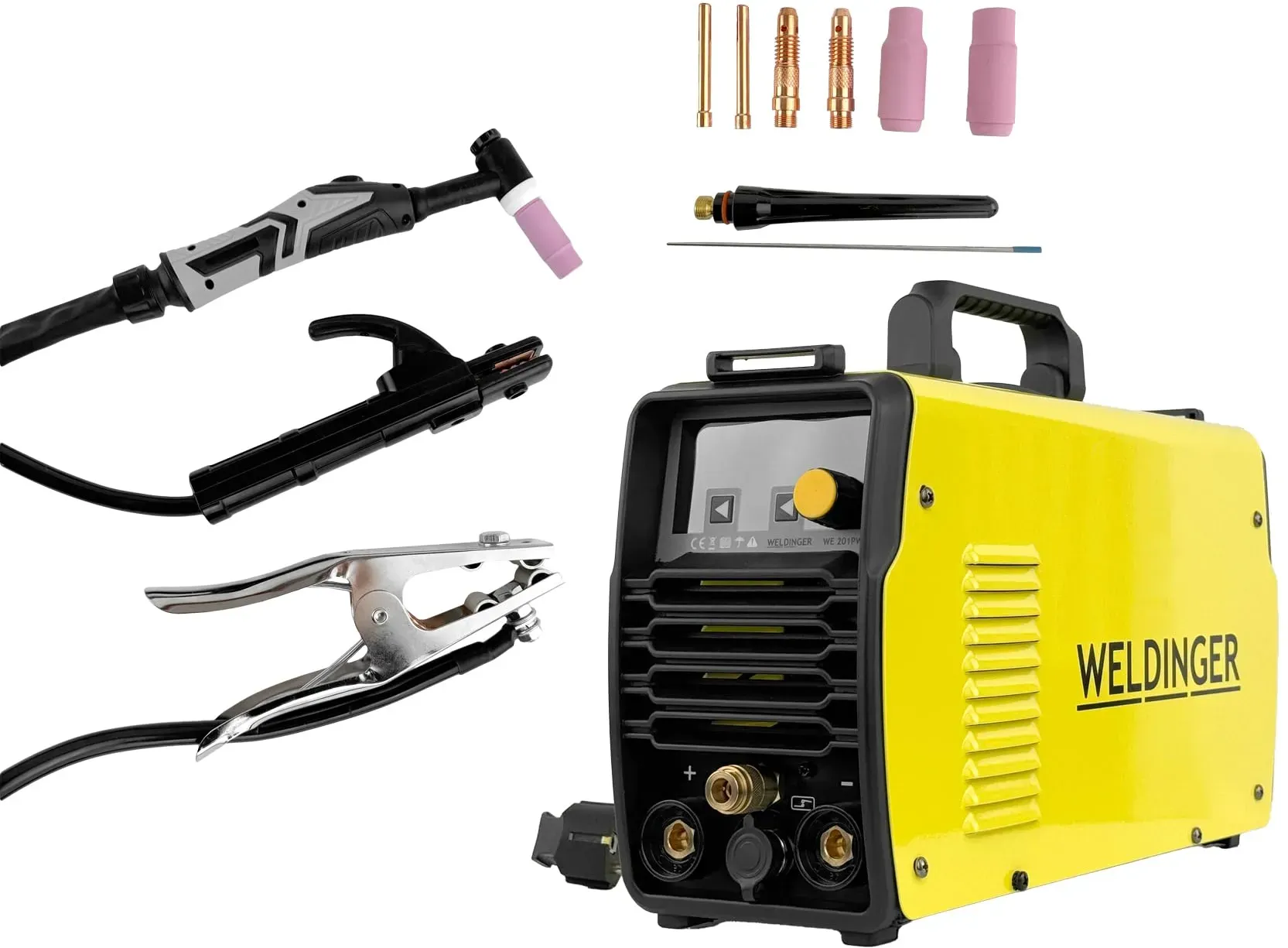 Zustand: Neu - WIG-Schweißgeräte - WELDINGER DINGER Germany GmbH - - EAN: 4251314274137 - WELDINGER WIG-Schweißinverter WE 202 DC plus mit 200 A Leistung, HF-Zündung, Pulsfunktion, Hot Start und Antistick Schweißgerät für alle Reparaturarbeiten an Stahl-, Edelstahl- und Kupferteilen und zum Schweißen von Rohren und Kesseln mobil einsetzbar mit 100% ED bei 155 A, mit regelbaren WIG-Parametern, digitaler Steuerung und Jobspeicher inklusive 4 m WIG-Schlauchpaket SR 26 mit Teillederummantelung, Brennergriff mit Kugelgelenk und 4 m Massekabel schweißt Elektroden bis 4 mm bei 200 A (ein passendes Elektrodenkabel ist separat erhältlich), Gewicht nur knapp 6,8 kg, Lieferung mit deutscher Bedienungsanleitung, WELDINGER 5-Jahres- gemäß § 5+6 der bedingungen, weitere Infos: auf Verkäufernamen und dann auf Allgemeine Geschäftsbedingungen und Hilfe klicken! - Verkäufer: HausundWerkstatt24 im amazon.de Marketplace ![]() ![]() WELDINGER WIG-Schweißgerät WE 201PW plus DC HF Lift Puls 2T/4T MMA 200 A