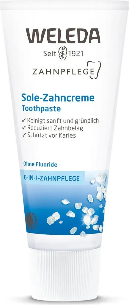 20 Händlerangebote bei billiger.de - Kategorie: Zahnpflegeartikel - Weleda - Die Weleda Sole Zahncreme wird zum medizinischen Schutz vor Karies und Zahnstein angewendet. Die Zahncreme enthält als löslichen Putzkörper Natriumcarbonat und anregendes Pfefferminzöl. Das Natriumcarbonat neutralisiert schädliche Säuren, dadurch wird Karies vorgebeugt und die Neubildung von Zahnstein wird gehemmt. Außerdem regt der Putzkörper aus Salzkristallen den Speichelfluss und damit die physiologische Selbstreinigung an. Das Pfefferminzöl schafft langanhaltende Frische. Außerdem kann die Weleda Sole-Zahncreme Aphten heilen und desinfizieren. - GTIN:4001638098090 - PZN:02436546 ![]() ![]() Weleda Sole Zahncreme 75 ml