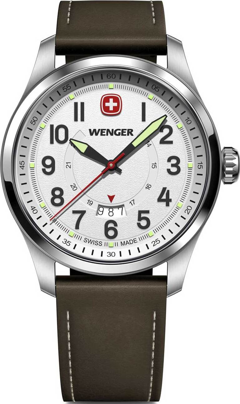 Auf Lager Versand durch AmazonWENGER Herren Armbanduhr Terragraph, Ø 43 mm, Swiss Made, Analog Quarz, Wasserdicht bis 100 m, Leder-Armband, Weiß/Braun, 01.0541.120