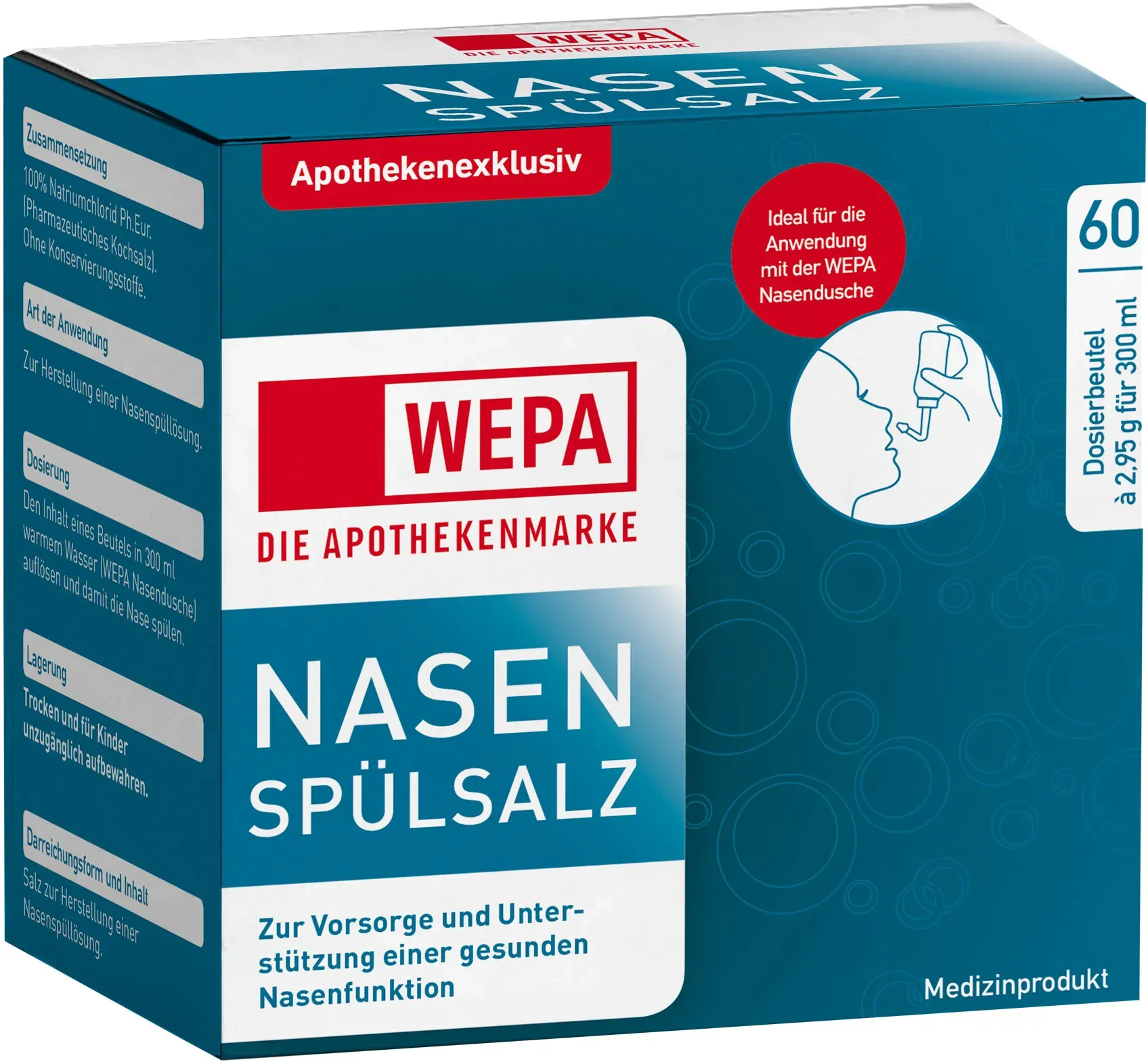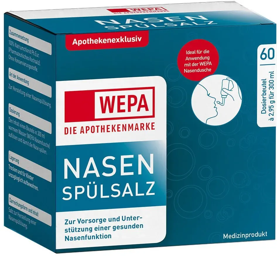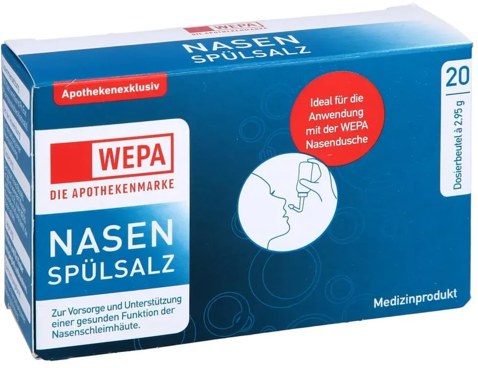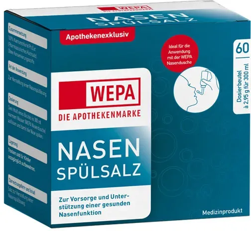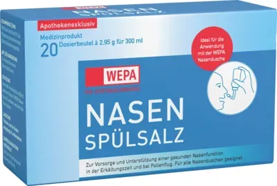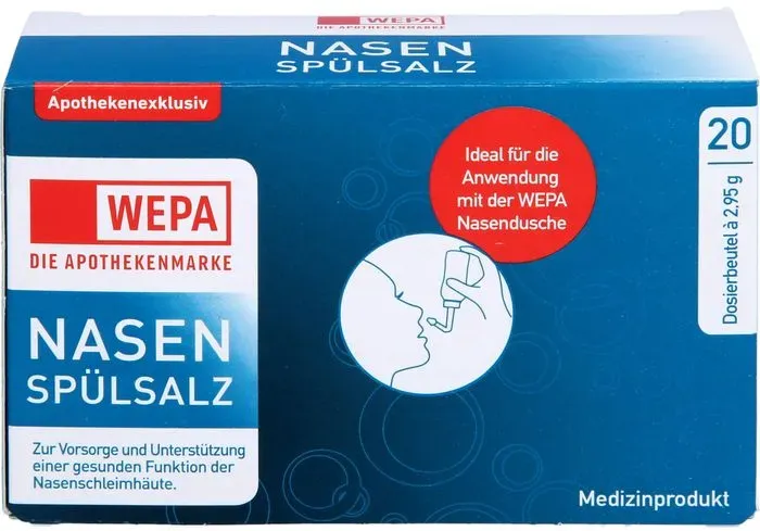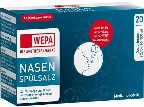 84,58 /kg - Kategorie: Medizinischer Bedarf - Wepa - GTIN:4150142562693 - PZN:14256269 - WEPA NasenspülsalzNasenspülungen mit Salzwasser reinigen die Nase schonend und unterstützen den Abtransport von Staub, Schmutz, Allergenen und potentiellen Krankheitserregern. Durch die regelmäßige Anwendung von Nasenspülungen werden die Nasenschleimhäute befeuchtet und in ihrer natürlichen Funktion unterstützt.Anwendungsgebiete:Zur Reinigung und zur Pflege der Nasenschleimhaut z. B. bei vermehrter Staub- und Schmutzbelastung, zur Prophylaxe in Zeiten erhöhter Erkältungsgefahr sowie bei Pollenflug. Zusammensetzung Nasenspülsalz: 100% Natriumchlorid Ph. Eur. (Pharmazeutisches Kochsalz); enthält keine weiteren Zusätze.Darreichungsform und Inhalt:Salz zur Herstellung einer Nasenspüllösung20 Dosierbeutel 2,95 gAuch als 60er Packung erhältlich.Das Nasenspülsalz ist bei vorschriftsmäßiger Anwendung für Erwachsene und Kinder ab n, wie auch während der Schwangerschaft und Stillzeit geeignet. - 4,99 Euro bei Shop Apotheke DE - gefunden von billiger.de ![]() ![]() WEPA Nasenspülsalz 20X2.95 g
