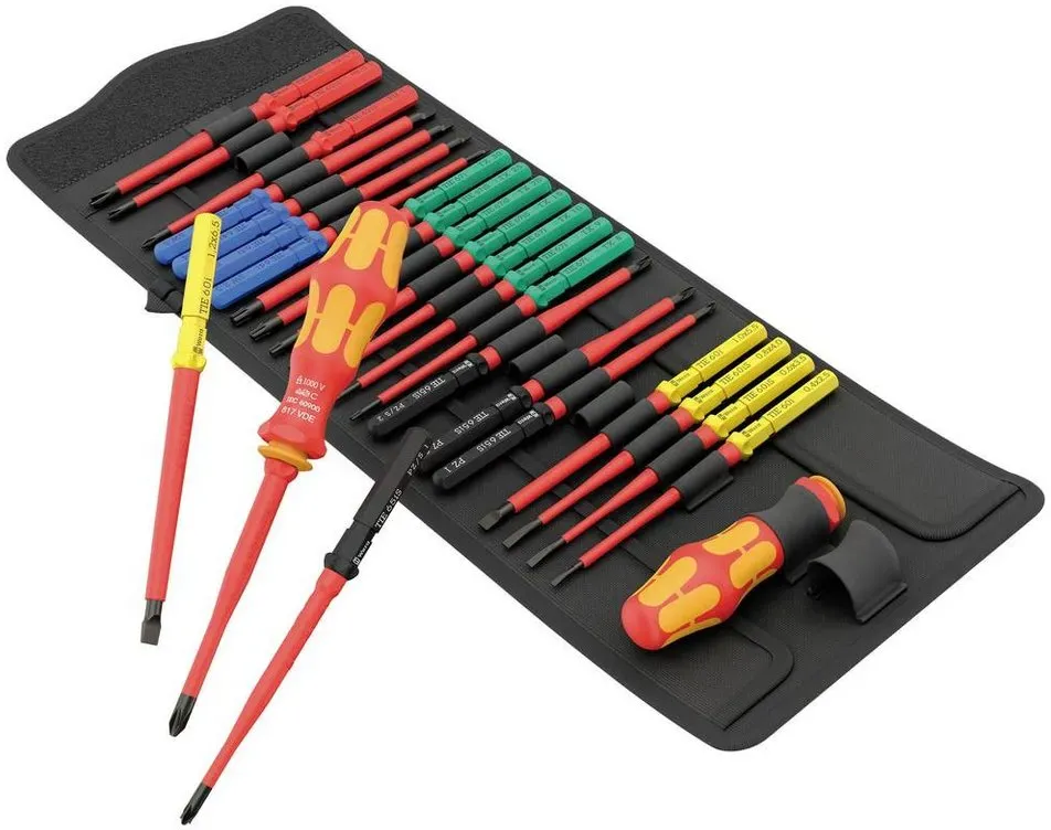 Besondere Merkmale: Die Klingen sind teilweise mit reduziertem Durchmesser (iS-Ausführung) gefertigt, wodurch auch tiefliegende Schraubelemente erreichbar sind.[1][2] Das Set wird in einer robusten Falttasche geliefert und ist mit dem Wera 2go System kompatibel.[2][4] Sicherheitsstandards und ZertifizierungEin entscheidender Vorteil dieses Produkts ist die VDE-Zertifizierung nach IEC 60900. Die Werkzeuge sind stückgeprüft bei 10.000 V und zugelassen für sicheres Arbeiten bis 1.000 Volt.[1][2][4] Dies macht das Set ideal für Elektroinstallationen und Arbeiten an elektrischen Anlagen. Ergonomie und HandhabungDas Set verfügt über den bewährten Kraftform Plus Griff mit intelligenter Zoneneinteilung:[1][2]