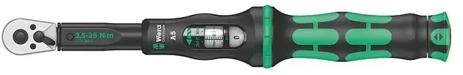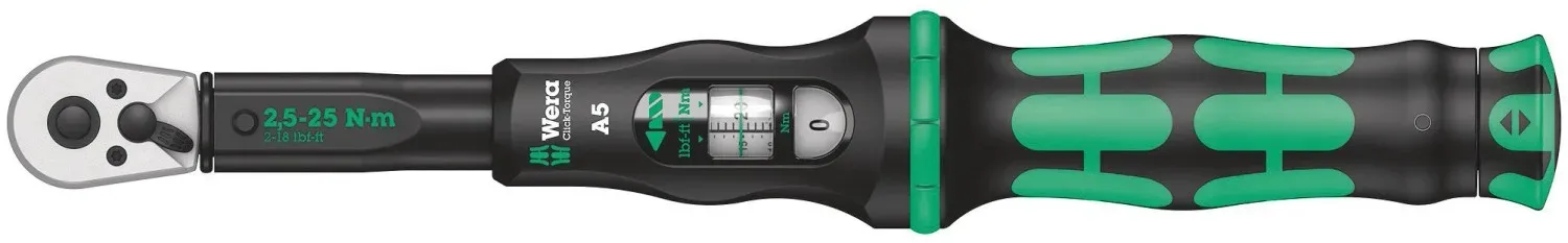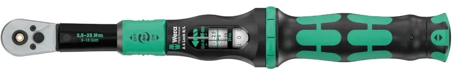 Kategorie: Schraubenschlüssel - WERA - GTIN:4013288233653 - WERA Drehmomentschlüssel 2,5-25 Nm Click-Torque A 6 | R/L Klick-Drehmomentschlüssel für kontrollierten Rechts- und Linksanzug im unverkennbaren Wera Design. Mit durchgehender Außensechskant-Aufnahme für 1/4' Bits (Bits können von beiden Seiten des Drehmomentschlüssels eingesetzt werden). Die Drehmomentfunktion kann deaktiviert werden (Torque Lock Funktion), sodass das Werkzeug auch zum Lösen verwendet werden kann. Die Ratsche löst die wichtigsten Schraubprobleme rund ums Fahrrad bei zuverlässiger Kontrolle der aufgebrachten Drehmomente zum Schutz der sensiblen Bauteile. Sehr robuste Ausführung bei hoher Genauigkeit gemäß DIN EN ISO 6789-1:2017-07. Das hör- und fühlbare Einrasten bei Erreichen der Skalenwerte erleichtert zusätzlich die sichere Einstellung des gewünschten Drehmomentwertes. Serie Click-Torque Drehmomentschlüssel Mit Klick-Drehmomentschlüssel im unverkennbaren Wera Design. Torque Lock Funktion Die Drehmomentfunktion kann deaktiviert werden, sodass das Werkzeug auch zum Lösen verwendet werden kann. Genau Die Präzision liegt bei 4 % gemäß DIN EN ISO 6789-1:2017-07. Einfach und sicher Leichte Einstellung und Sicherung des gewünschten Drehmomentwertes; ablesbar auf Haupt- und Feinskala. Einfache Einstellung Mit hör- und fühlbarem Einrasten bei Erreichen der Skalenwerte. Auslösemechanismus Bei Erreichen des eingestellten Drehmomentwerts löst ein hör- und fühlbarer Mechanismus aus. Robuste Modelle Sehr ... Dieses Kombi-Set aus Click-Torque C 3 und A 6 ist eine Premium-Option für professionelle Anwender, die eine breite Abdeckung benötigen. ![]() ![]()