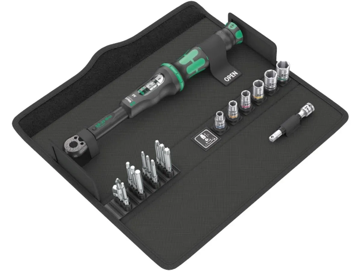 Zustand: Gebraucht - Werkzeuge Fahrradwerkzeuge - Wera Wera Werkzeuge GmbH - 05004180001 - EAN: 4013288207685 - 16-teiliges Schraubwerkzeug-Set für Fahrradanwendungen mit Drehmomentkontrolle inklusive Wera Click-Torque Schlüssel A 5 (2, 5-25 Nm) Nüsse und Bitnüsse für die gängigsten Schraubenprofile bei Straßenfahrrädern, Mountainbikes und E-Bikes Einfache Einstellung und Sicherung des gewünschten Drehmomentwertes mit hör- und fühlbarem Einrasten bei Erreichen der Skalenwerte (Klick 1) Sicher dosierte Kraft: bei Erreichen des eingestellten Werts löst der Drehmomentschlüssel hör- und fühlbar aus (Klick 2) Robuste, oberflächenschonende, kompakte textile Box - 1 Händler im amazon.de Marketplace Dieser Wera Click-Torque A 5 ist DAkkS-akkreditiert kalibriert, was höchste Präzision und Zuverlässigkeit garantiert. ![]() ![]() Wera Click-Torque A 5 05075604001 Drehmomentschlüssel kalibriert (DAkkS-akkreditiertes Labor) mit Umschaltknarre 1/4 (6.3 mm) 2.5 - 25 Nm