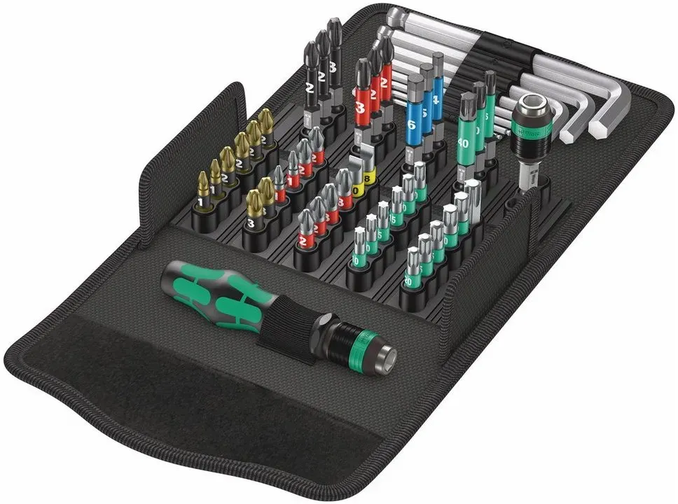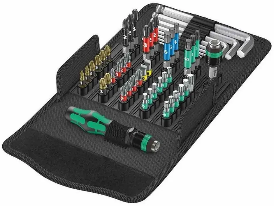 Kategorie: Zubehör für Elektrowerkzeug - WERA - GTIN:4013288179968 - 52-teilig; in oberflächenschonender, kompakter textiler Box mit hoher Robustheit. Geringes Volumen und Gewicht für vereinfachte Mobilität. Kompaktes Werkzeug-Set mit 52 Schraubwerkzeugen. 1 Bit-Handhalter Rapidaptor mit Schnellwechselfutter; 1 B Bithalter Rapidaptor mit Schnellwechselfutter zur Aufnahme in die Schraubermaschine oder zum Einsatz in das Bohrfutter der elektronischen Bohrmaschine; 30 BiTorsion Bits mit 25 mm Länge für lange Lebensdauer, zähhart (BTZ), für den universellen Einsatz, extrahart (BTH), 12 Impaktor-Bits mit 50 mm Länge für besonders hohe Anforderungen, 8 Winkelschlüssel mit Hex-Plus Profil (verhindert das Runddrehen von Innensechskantschrauben) und Sechskant-Kugelkopf am langen Schenkel für Arbeiten im Winkel; textile Box mit sehr hoher Robustheit und Langlebigkeit; aufrecht positionierbar zur übersichtlichen Lagerung im Werkstattregal; zusätzlicher Oberflächenschutz durch textiles Außenmaterial. - 87,99 Euro bei Thalia.de - gefunden von billiger.de Dieses Bit-Set von OTTO ist eine gute Option für diejenigen, die eine breite Auswahl an Schlitz- und Kreuzschlitz-Bits benötigen. ![]() ![]()