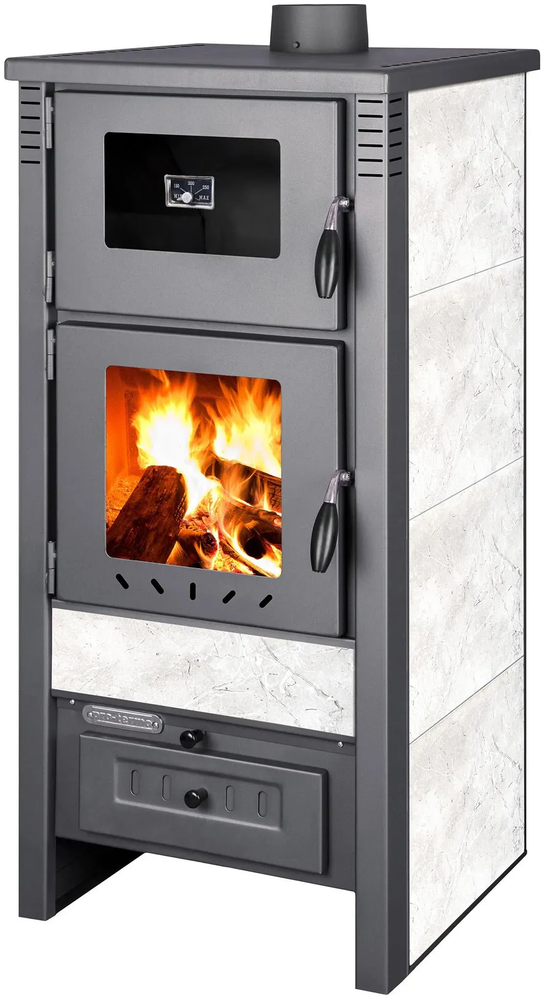 Verfügbarkeit: Auf Lager - EEK: A - Kategorie: Kamine & öfen - Prometey - GTIN:4260700961759 - EFFIZIENTE HEIZLEISTUNG: Mit einer Nennwärmeleistung von 7 kW sorgt der Kaminofen für eine angenehme und gleichmäßige Wärmeverteilung in großen Räumen. HOHER WIRKUNGSGRAD: Dank der Energieeffizienzklasse A+ heizt der Ofen besonders umweltschonend und kosteneffizient. ROBUSTE BAUWEISE: Gefertigt aus robustem Stahlblech, rt der Ofen eine lange Lebensdauer und Stabilität. GROSSES SICHTFENSTER: Das große Sichtfenster mit Scheibenhinterlüftung ermöglicht einen faszinierenden Blick auf das lodernde Feuer und schafft eine behagliche Atmosphäre. PRAKTISCHE HANDHABUNG: Der Kaminofen ist mit einem leicht zugänglichen Aschekasten und einem praktischen Holzlagerfach im unteren Bereich ausgestattet, was die Bedienung und Reinigung erleichtert. GROSSE BRENNKAMMER: Die geräumige Brennkammer ist optimiert für Holzscheite bis zu 40 cm, was eine einfache Handhabung und effiziente Verbrennung ermöglicht. Für Dauer- und Zeitbrand geeignet. Technische Daten: - Gesamtmaße: Höhe 79 cm, Breite 50 cm, Tiefe 42 cm - Brennkammer Maße: Höhe 39 cm, Breite 35 cm, Tiefe 28 cm - Durchmesser Rauchabzugrohr: Ø 130 mm - Gewicht: 64 kg - Farbe: Anthrazit - Mindestabstand zu brennbaren Materialien von der Seite: 70 cm - Mindestabstand zu brennbaren Materialien von Vorne: 130 cm - Mindestabstand zu brennbaren Materialien von Hinten: 50 cm - 4,2 kW minimale Heizleistung - 7,0 kW ... Dieser ProTermo Kaminofen überzeugt mit 6,5 kW Heizleistung, Schamottsteinen und einem Sichtfenster für eine angenehme Atmosphäre. ![]() ![]() ProTermo Lava Basic Glass Kaminofen mit Schamottsteinen 6,5 kW Heizleistung 33x36x82 cm Holzofen mit Sichtfenster Werkstattofen - Bauart 2