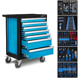 Gesamtsortiment Baumarkt + Garten Werkzeug + Werkstatt Werkstatteinrichtung Werkzeugaufbewahrung Werkzeugwagen + Montagewagen Handwerkzeuge - EAN:4000896214488 - Extrem robuste Konstruktion durch doppelwandige Bauweise mit Kantenschutz an allen vier Ecken. Verfügt über eine seitliche Verriegelungsposition für bessere Bedienbarkeit und ein 2-stufiges Verriegelungssystem für erhöhte Sicherheit, zusätzlich mit Zentralverriegelung. Selbstschliessende Schubladen und ein gegenseitiger Auszugsstopp minimieren das Risiko des Umkippens. Jede Schublade hat eine Tragfähigkeit von 25 kg, mit einer gesamten statischen Tragfähigkeit von 540 kg. Ausgestattet mit 2 drehbaren Rollen mit Doppelstopps und einer Kunststoffarbeitsfläche. Metallgriff inklusive. Design-Spezifikationen: 5 kleine Schubladen (B 522 x T 398 x H 77 mm) und 2 grosse Schubladen (B 522 x T 398 x H 162 mm). - gefunden von Kelkoo Der GEDORE Werkstattwagen MECHANIC ist mit 166 Teilen bestückt und bietet eine umfassende Werkzeugausstattung für professionelle Anwendungen. ![]() Kaiserkraf t.de