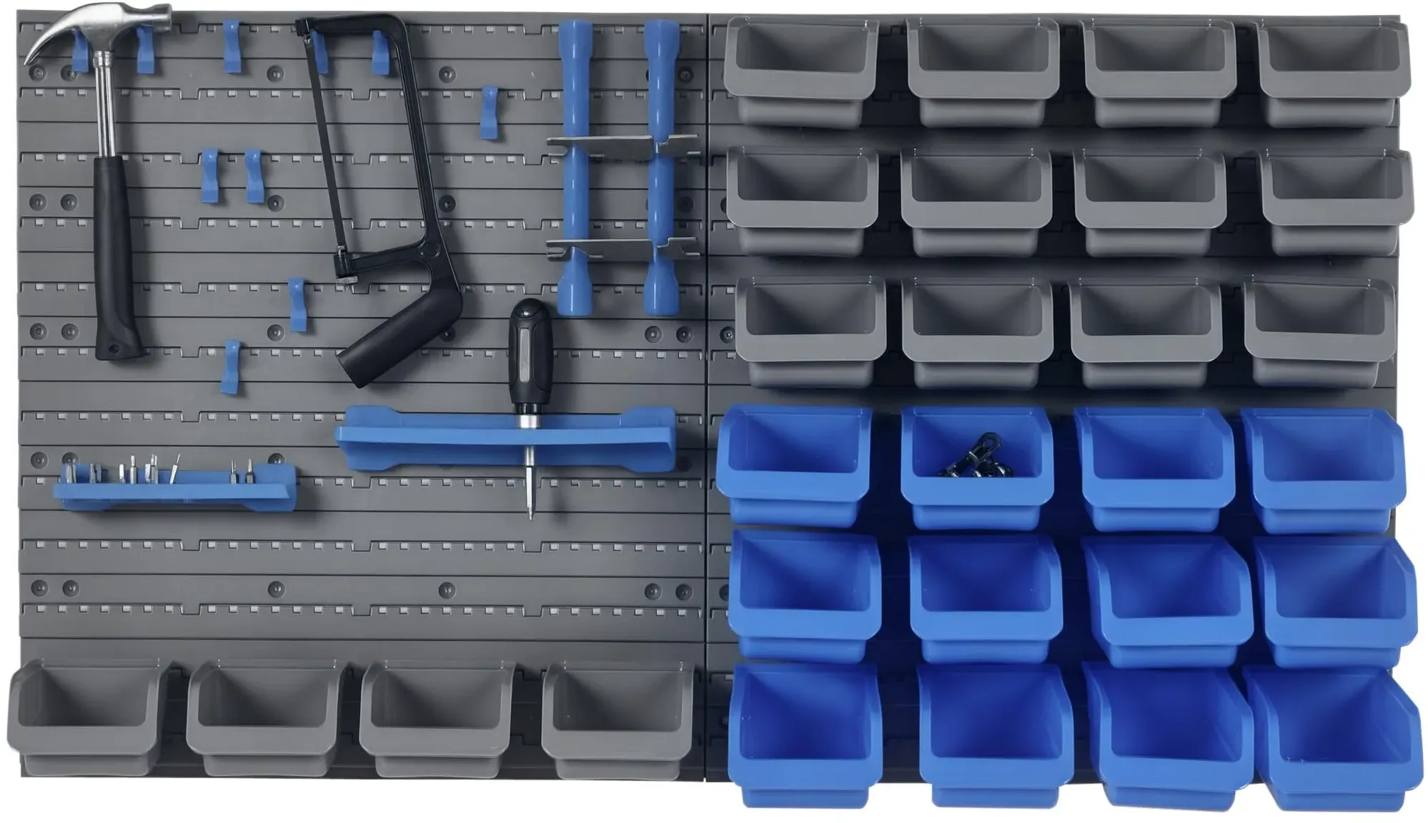 2 Händlerangebote bei billiger.de - Kategorie: Werkstatteinrichtung - Homcom - - 44-Teilig: Diese Werkzeugwand besteht aus 44 Teilen. Sie eignet sich für Werkstätten, Garagen und Schuppen. Sie bietet viel Stauraum für Werkzeug und Zubehör. - Kunststoffkörper: Die dicke und stabile Konstruktion mit zwei grauen Rückseiten hält Ihre Werkzeuge und sorgt dafür, dass sie problemlos an ihrem Platz bleiben. Außerdem sind die unterschiedlich großen Kunststoffbehälter bequem stapelbar und können unabhängig voneinander verwendet werden. - Praktisches Design: Die Werkzeugwand kann vertikal oder horizontal an der Wand montiert werden. Durch die Befestigung an der Wand sparen Sie viel Platz. - Langlebig: Die Werkzeugwand besteht aus robustem Kunststoff und kann bis zu 30 kg Gewicht tragen. - Produktdetails: Gesamtmaße: 54B x 22T x 95H cm, Belastbarkeit: 30 kg (Werkzeugwand), 1 kg (kleiner Behälter), 1,5 kg (mittlerer Behälter), 2 kg (großer Behälter) Beschreibung: Diese große, 44-teilige Werkzeugwand von DURHAND ermöglicht eine platzsparende und gutsortierte Aufbewahrung Ihrer Werkzeuge und zahlreicher Kleinteile. Die abnehmbaren und stapelbaren Boxen bieten viel Platz für Schrauben und andere Kleinteile. Die Werkzeugwand kann horizontal oder vertikal an der Wand angebracht werden, sodass Sie reichlich Bodenfläche sparen. Aus hochstabilem Kunststoff gefertigt, trägt diese Werkzeugwand ein Gesamtgewicht bis zu 30 kg. Technische Daten: - Farbe: Blau - Material: Kunststoff - Gesamtmaße: 54B ... Manomano.d e