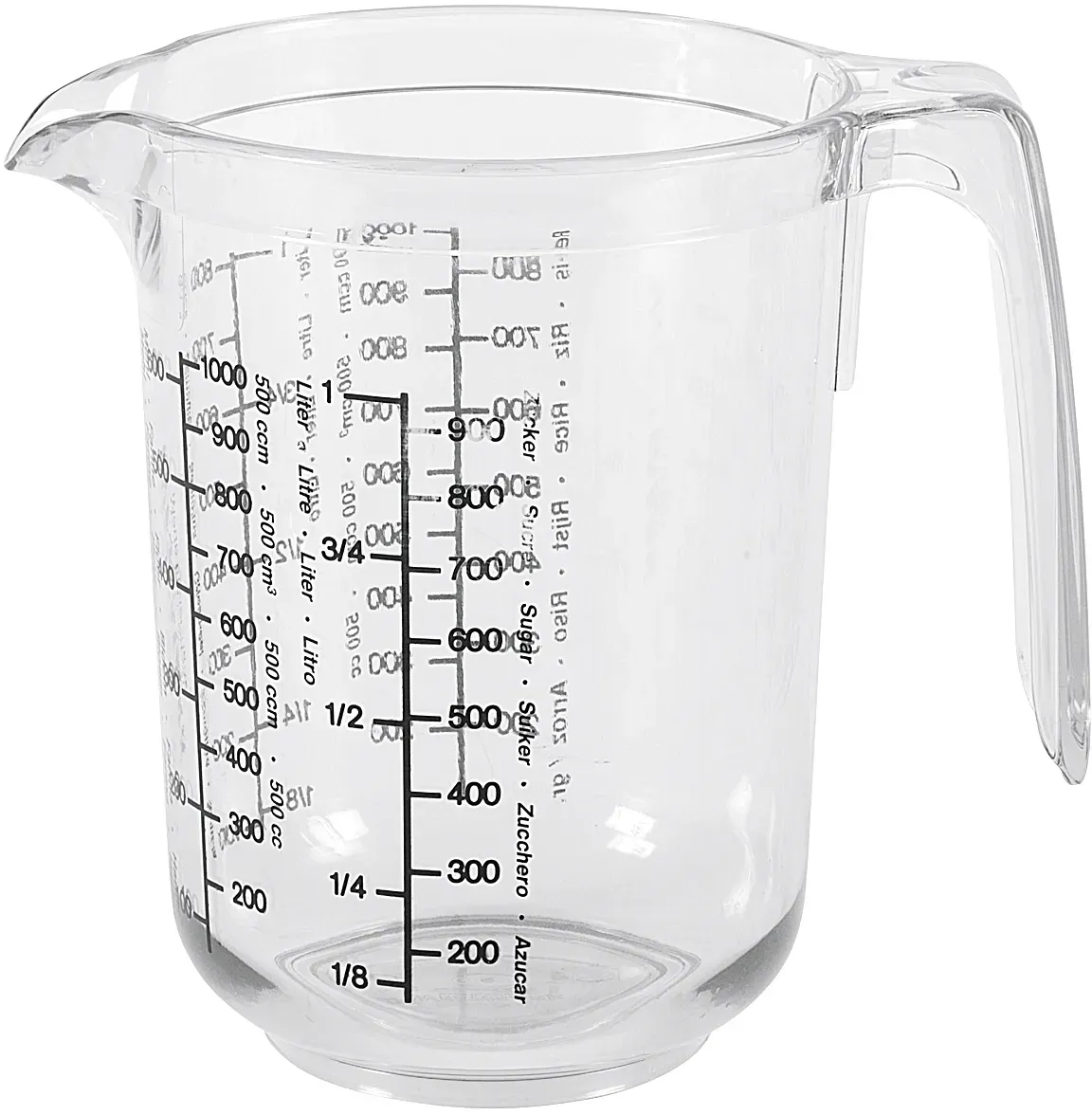 EAN: 4004094306877 - Messkanne Gerda mit aufgedruckter Messskala (deutsch, englisch, franz sich, holl ndisch, italienisch, spanisch) mit rutschfestem Standfu aus Kunststoff (SAN) Sp lmaschinengeeignet Inhalt: 1 Liter ca. 150 mm Dieser Messbecher hat einen Aufdruck in verschiedenen Sprachen und durch den rutschfesten Fuss ein sicheren Stand. Au erdem ist diese Messkanne sp lmaschinengeeignet . Der Messbecher ist aus SAN (Styrolacrylnitril ist ein sehr hartes Acryl und wird bei der Geschirrherstellung angewendet. Es ist Lebensmittegerecht, geschmacksneutral, bruch- und sp lmaschinenfest.) - bei fleischerbedarf.eu - aus Yadore Produktdaten Dieser 1-Liter-Messbecher bietet ein hervorragendes Preis-Leistungs-Verhältnis mit vielseitigen Messskalen für verschiedene Zutaten. ![]() ![]() Westmark Gerda Messbecher 1l - Messskalen für Gramm (für Mehl, Zucker, Reis und Grieß), Liter & Milliliter - Made in Germany - Kunststoff - 18 x 12,4 x 16,5 cm (transparent)