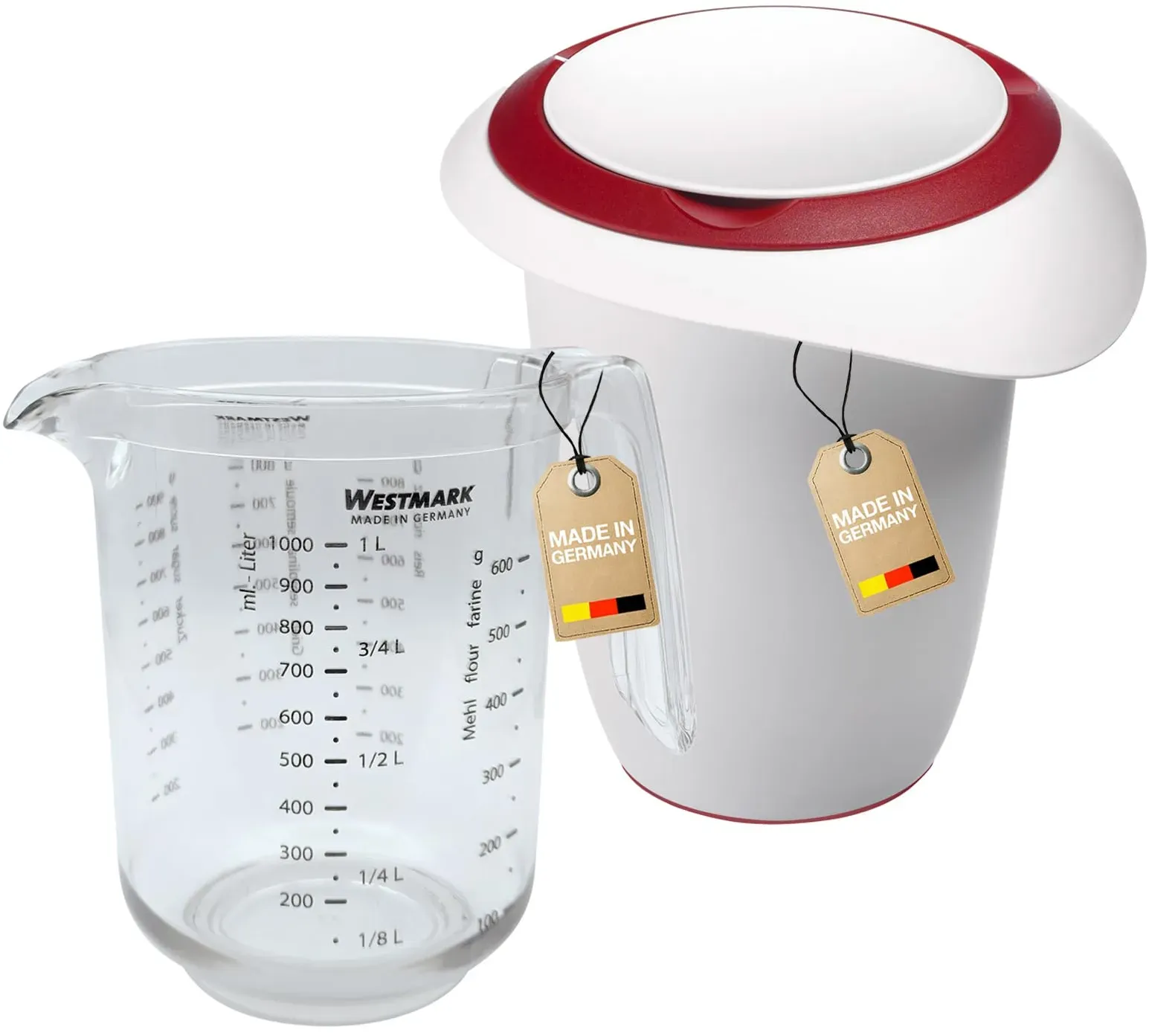 lieferbar-in 2-3 Werktagen bei dirWESTMARK Messbecher Set 2tlg, Messkanne + Quirltopf mit zweigeteiltem Deckel, Gerda, SAN rot|weiß