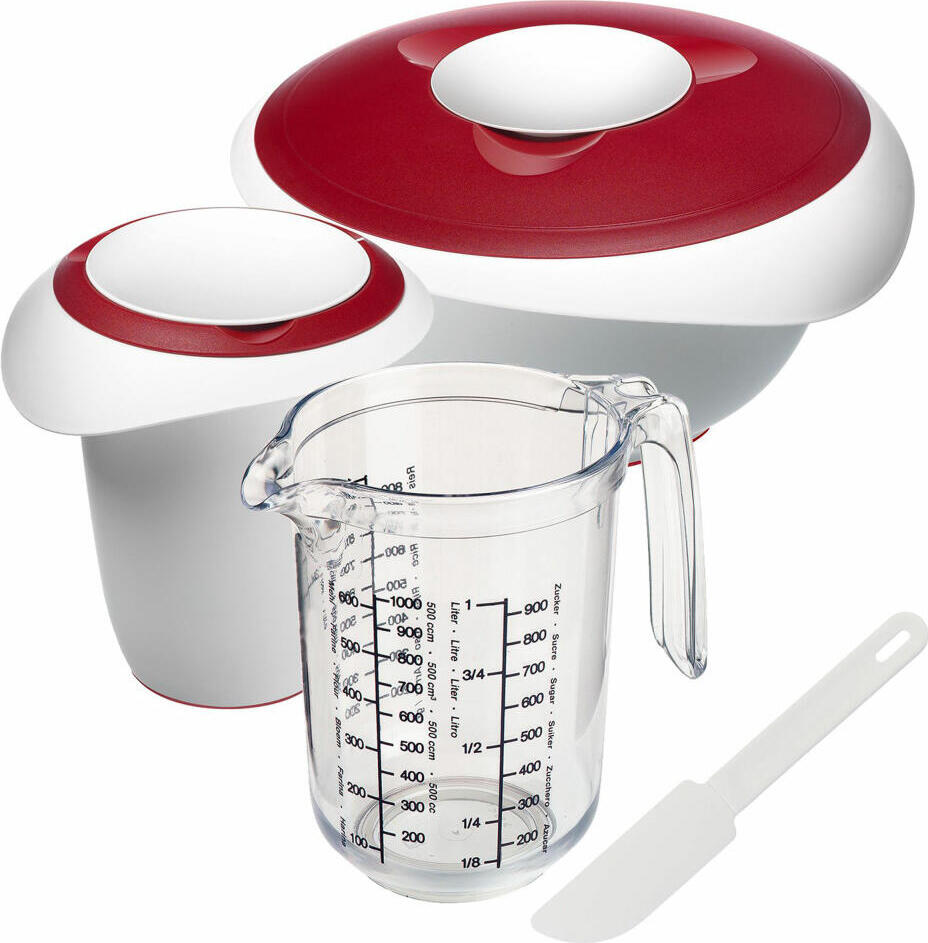 EAN: 4004094016745 - Die Rührschüssel und der Quirltopf mit zweigeteiltem Deckel sind ideal zum Mischen und Verrühren von Koch-und Backzutaten und zum Steifschlagen von Eischnee und Sahne. Der rote Rand dient als Spritzschutz beim Mixen und durch das Zusammenstecken mitdem weißen Innenteil erhalten Sie einen vollständigen Deckel. Der Gummiring auf der Unterseite sorgt für festen Stand auf glatten Oberflächen und der breite Griff ermöglicht einen sicheren Halt. - Pflegehinweis: spülmaschinengeeignet Länge: 27 cm Breite: 28.5 cm Höhe: 21.5 cm Material: PP, PE, SAN Farbe: Weiß/Rot/Transparent Hersteller-Artikelnummer: 315522E7 - bei kaufland.de - aus Yadore Produktdaten Dieses umfangreiche 4-teilige Back-Set ist eine hervorragende Investition für alle, die gerne backen und eine komplette Ausstattung suchen. ![]() ![]() Westmark Back-Set, 4tlg., Rührschüssel, Quirltopf, Messkanne + Schaber/Kuchenlöser, Kunststoff, Gerda, Weiß/Rot/Transparent, 315522E7
