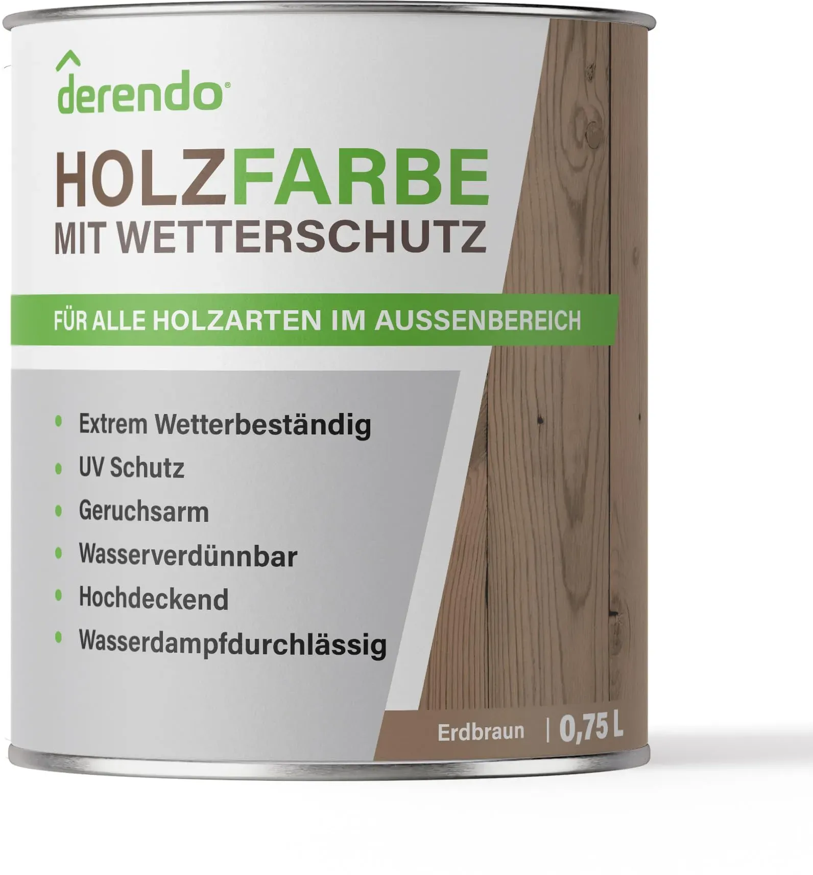 Zustand: Neu - 10,00 € / l - Lacke - Wilckens - 11181700080 - EAN: 4000590051785 - Hochwertige Deck- & Schutzfarbe mit einer hohen Witterungsbeständigkeit Geeignet für Hölzer, Zink, Aluminium und Hart-PVC im Innen- und Außenbereich Hochdeckend, geruchsarm, dauerelastisch Blauer Engel: Umweltschonend - da schadstoffarm Ergiebigkeit 2,5l: ca. 25 m² bei einem Anstrich, je nach Beschaffenheit / Saugfähigkeit des Untergrundes - 10 Händler im amazon.de Marketplace Die derendo Holzfarbe ist eine wetterfeste, seidenglänzende Wetterschutzfarbe in Erdbraun mit hoher Deckkraft für 29,99 Euro pro 750ml. ![]() ![]() derendo Holzfarbe braun außen wetterfest Wetterschutzfarbe Holz 750ml seidenglänzend Erdbraun Holzlack Außenbereich Holzschutzlasur hohe Deckkraft