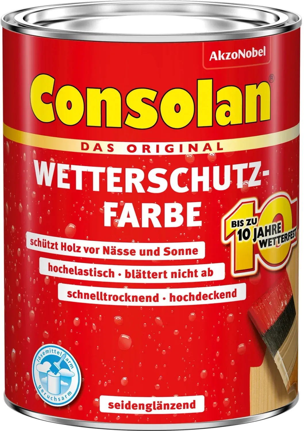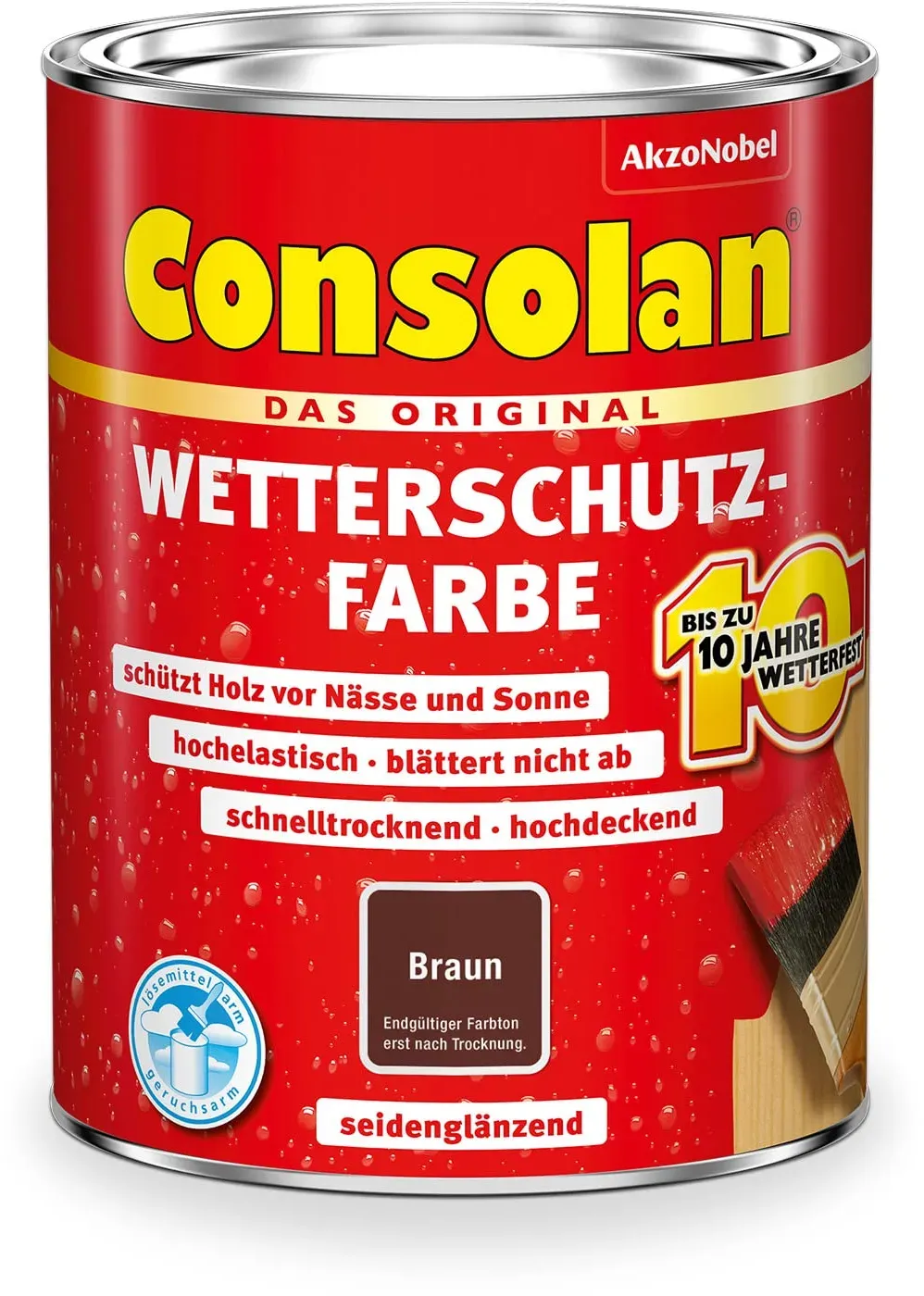 Kategorie: Farben & Lacke - derendo - GTIN:4251604929556 - PREMIUM WETTERSCHUTZ FüR IHR HOLZ: Die Derendo Holzschutzfarbe bietet langanhaltenden Schutz vor Witterungseinflüssen ideal für den Einsatz im Außenbereich. Perfekt um Holzmöbel vor Regen, Sonne und Schnee zu schützen. HOHE DECKKRAFT UND LEICHTE VERARBEITUNG: Derendo Holzfarbe für den Außenbereich ist ideal für Zäune, Gartenmöbel und vieles mehr. Sie lässt sich mühelos auftragen und sorgt für ein gleichmäßiges, deckendes Finish. Geeignet für Holz, Zinkblech und Putz. Reichweite ca. 9 Quadratmeter FRISCH GETöNT QUALITäT MADE IN GERMANY: Ihre Holzschutzfarbe wird erst kurz vor dem Versand frisch für Sie getönt. Dadurch ren wir höchste Qualität und vermeiden die Lagerung von fertiger Farbe für ein stets frisches, erstklassiges Ergebnis. EINFACHE ANWENDUNG & SCHNELLE TROCKNUNG: Mit der derendo Wetterschutzfarbe für außen können Sie Ihre Holzprojekte schnell und effizient abschließen. Die Farbe lässt sich mühelos auftragen und trocknet in kürzester Zeit für professionelle Ergebnisse ohne großen Aufwand. UMWELTFREUNDLICHE FORMEL: Die Derendo Holzfarbe ist wasserbasiert und enthält keine schädlichen Lösungsmittel, was ihn geruchsarm und sicher in der Anwendung macht. - 29,99 Euro bei Amazon Marketplace Home Improvement - gefunden von billiger.de Die Consolan Wetterschutzfarbe in Braun seidenglänzend ist mit 41,99 Euro für 2,5 Liter eine gute Option für größere Flächen. ![]() ![]() Consolan Wetterschutzfarbe Braun seidenglänzend 2,5 l