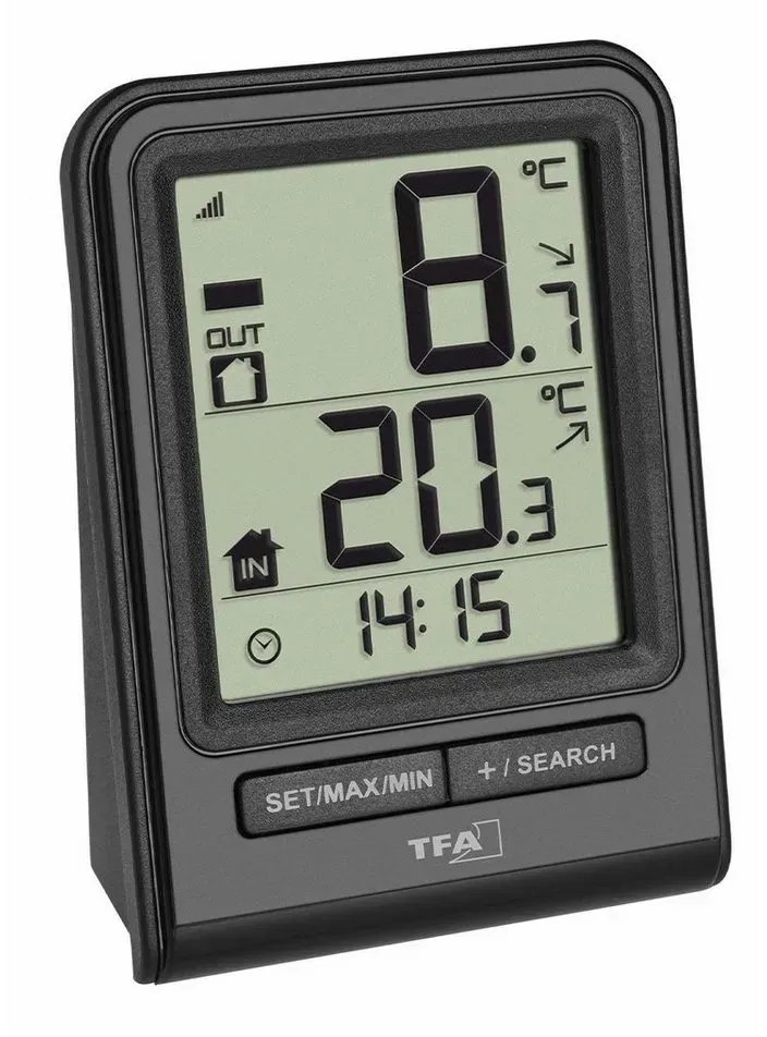 4 Händlerangebote bei billiger.de - Kategorie: Wetterstationen - TFA - Der einfache, aber genaue Funkthermometer zeigt absolut bedienungsfrei die Innen- und Außentemperatur an. Der Funk-Thermometer empfängt die Außentemperatur per Funkstrecke über einen mitgelieferten Außensender. Tiefst- und Höchstwerte sind per Tastendruck abfragbar. Die Trendpfeile zeigen ihnen ob die Temperaturwerte aktuell steigen oder fallenTechnische Daten Außentemperaturanzeige über Funk vom mitgelieferten Funksender Reichweite bis zu 100 Meter Frequenz 433 MHz Messbereich Aussentemperatur: -40 bis + 65 C Innentemperaturanzeige: 0 bis + 50 C Uhrzeit Minimal- und Maximalwerte der Temperaturen Manuelle oder Automatische Rückstellung Masse Gerät: 67 x 35 x 93 mm Masse Sender: 130 x 40 x 21 mm Zum Aufstellen oder an die Wand hängen Batterien 2 x 1,5V AA und 2 x 1,5V AAA (nicht mitgeliefert)Lieferumfang: 1 x Anzeigegerät 1 x Aussensender 1 x Bedienungsanleitung Marke: TFA Uhren Funktionen: Atom-/Funkuhr Uhrentyp: Wetterstationen Uhrwerktyp: Funk Außentemperatur über kabellosen FunksenderAnzeige der InnentemperaturTendenzpfeileHöchst- und TiefstwerteUhrzeitProduktbeschreibungImmer auf dem aktuellen Stand in Sachen Temperatur mit dem 'PRISMA' Funk-Thermometer von TFA. Die Außentemperatur vor Ort wird über einen eigenen Funksender ermittelt, die Raumtemperatur misst ein interner Sensor. Die Kontrolle der Raumtemperatur ist ein wichtiger Faktor für ein behagliches und gesundes Wohnklima und hilft beim ... ![]() ![]() TFA 30.3071.01 schwarz LOGO 2.0 Funk-Thermometer