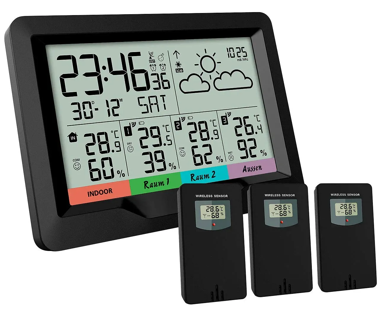 Wetterstationen Gesamtsortiment Haushalt Raumklima Umwelt Messgeräte Wetterstation Uhren Radios & Wetterstationen - EAN:4062861847596 - Die Funk Wetterstation von Bearware ist ein modernes Gerät, das mit einem grossen Farbdisplay ausgestattet ist und präzise Informationen zu Innen- und Aussentemperatur, Luftfeuchtigkeit und Luftdruck liefert. Sie nutzt drei kabellose Aussensensoren, die eine flexible und genaue Messung ermöglichen. Die Wetterstation bietet eine Wettervorhersage, die durch sieben verschiedene Symbole dargestellt wird, und zeigt zusätzlich Trends für Temperatur, Luftfeuchtigkeit und Luftdruck an. Die einstellbare Hintergrundbeleuchtung sorgt für eine optimale Sichtbarkeit, während die integrierte DCF-Funkuhr die Uhrzeit genau anzeigt. Weitere nützliche Funktionen sind die Alarmfunktion mit Schlummermodus, die Datums- und Wochentagsanzeige sowie die Möglichkeit, die Temperatur in Celsius oder Fahrenheit anzuzeigen. Diese Wetterstation ist somit ein vielseitiges und praktisches Gerät für den täglichen Gebrauch. - Wettervorhersage mit sieben Symbolen - Trendanzeigen für Temperatur, Luftfeuchtigkeit und Luftdruck - Einstellbare Hintergrundbeleuchtung - Alarmfunktion mit Schlummermodus - Datenanzeige für Innen- und Aussentemperatur sowie Luftfeuchtigkeit. - gefunden von Kelkoo Die infactory Wetterstation mit 3 Funksensoren und XL-Display ist ideal für die Ã?berwachung mehrerer Innen- und AuÃ?enbereiche. ![]() ![]() infactory Wetterstation 3 Sensoren: Funk-Wetterstation; 3 Funksensoren; innen/außen; XL-Display; Wecker (Funk Thermometer mit 3 Sensoren, Funkwetterstation mit 3 Sensoren, Digitale Wanduhr)