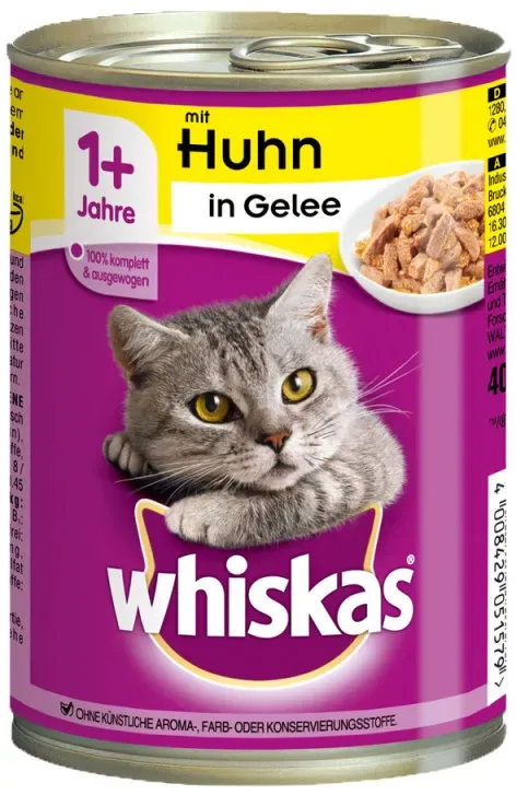 10 Händlerangebote bei billiger.de - Kategorie: Katzenfutter - Whiskas - Whiskas bietet leckere Mahlzeiten für jeden Gourmet. Mit den Whiskas 1+ Dosen bringst du Abwechslung in den Futternapf deiner Katze. Die unglaublich schmackhaften Sorten kommen selbst bei wählerischen Samtpfoten sehr gut an. Das Nassfutter wurde mit viel frischem Fleisch oder schmackhaftem Fisch hergestellt, sodass keine weiteren künstlichen Aromastoffe nötig sind. Zudem wird bei der Herstellung auf die Verwendung von künstlichen Farbstoffen verzichtet. Die Rezeptur beinhaltet viele wichtige Vitamine und Mineralstoffe, die deinen Stubentiger rundum perfekt versorgen, sodass er ein agiles und vitales Katzenleben führen kann. Deine Katze wird es lieben! Whiskas 1+ im überblick: Alleinfuttermittel für ausgewachsenen Katzen ab Schmackhaft und lecker: mit viel frischem Fleisch oder Fisch Ausgewogen: mit wichtigen Vitaminen und Nährstoffen Abwechslung: viele Sorten mit unterschiedlichen Geschmäckern bringen Vielfalt in den Futternapf deiner Katze Umweltgedanke: Verpackung zu 100% recyclingfähig Ohne künstliche Farbstoffe Ohne Aromastoffe sowie zusätzlichem Zucker Wir empfehlen als praktische Ergänzung: Dosendeckel: Praktische Dosendeckel aus Kunststoff zum Verschließen offener Dosen hält das Futter länger frisch leicht zu reinigen keine unangenehmen Gerüche im Raum - GTIN:4008429051579 Diese Dosen mit Huhn in Gelee sind eine solide Wahl für Katzen, die größere Portionen bevorzugen. ![]() 12 x 400 g Whiskas 1+ Dosen - Huhn in Gelee Katzenfutter Nass