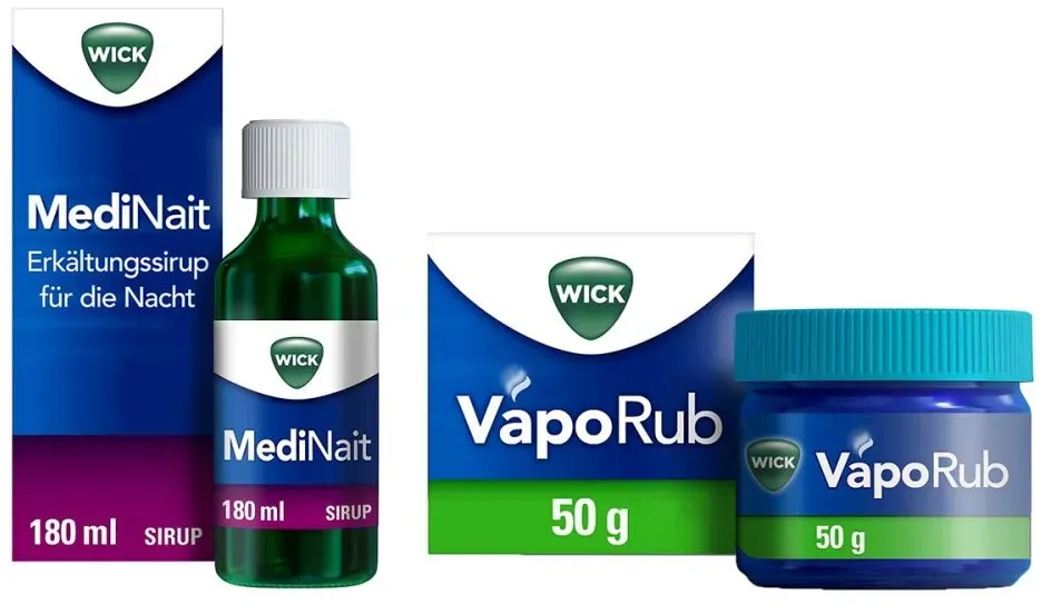 WICK Pharma - Zweigniederlassung der Procter & Gamble GmbH - EAN: 4150800254687 - Erkältungssirup für die NachtWICK MediNait Sirup behandelt Ihre Erkältungsbeschwerden, während Sie schlafen, damit Sie sich am Morgen wie neugeboren fühlen. WICK MediNait ist ein Erkältungssirup, der speziell entwickelt wurde, um Erkältungsbeschwerden über Nacht zu bekämpfen.Produkteigenschaften:Wirkt gegen 6 Erkältungsbeschwerden: Fieber, Kopfschmerzen, Gliederschmerzen, Halsschmerzen, Schnupfen und Reizhusten.Deutschlands Nr. 1 Erkätungssirup.Für einen erholsamen Schlaf trotz Erkältung.Speziell entwickelt um Erkältungsbeschwerden über Nacht zu bekämpfen.Gebrauchsanweisung:Zum Einnehmen: Für Erwachsene und Jugendliche ab 1 n. Dosierung: Erwachsene und Jungendliche ab 1 n nehmen 1 x täglich 30 ml (gemäß Markierung des Messbechers) abends vor dem Schlafengehen. Sofern nach 3 Tagen keine wesentliche Besserung eingetreten ist, bitte den Arzt aufsuchen.Warnhinweise:Für Erwachsene und Jugendliche ab 1 n. Packungsbeilage beachten. Nach Einnahme keine Maschinen bedienen oder Fahrzeuge lenken. Arzneimittel für Kinder unzugänglich aufbewahren. Arzneimittel nicht ohne ärztlichen Rat längere Zeit oder in höheren Dosen anwenden. Apothekenpflichtig. Pflichttext:WICK MediNait Erkältungssirup für die NachtAnwendungsgebiete: Zur symptomatischen Behandlung von gemeinsam auftretenden Beschwerden wie Kopf-, Glieder- oder Halsschmerzen, Fieber, Schnupfen und Reizhusten infolge einer Erkältung oder eines ... Dieses Angebot ist ideal für den Vorrat, da es zwei Flaschen Wick MediNait zu einem günstigen Preis bündelt. ![]() 2x Wick MediNait Erkältungssirup für die Nacht 2x180 ml Sirup