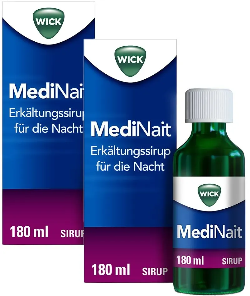 Verfügbarkeit: Sofort lieferbar, 1-2 Werktage (versandfertig) - 71,11 €/l - Kategorie: Arzneimittel - WICK - GTIN:4150141690045 - PZN:14169004 - WICK MediNait mit Anisgeschmack Sirup 180 ml - 12,80 Euro bei medikamente-per-klick.de - gefunden von billiger.de Dies ist das günstigste Angebot für den klassischen Wick MediNait Erkältungssirup in der Standardgröße (180 ml) von einem bekannten Preisvergleichsportal. ![]() ![]() WICK MediNait Erkältungssirup für die Nacht 180 ml