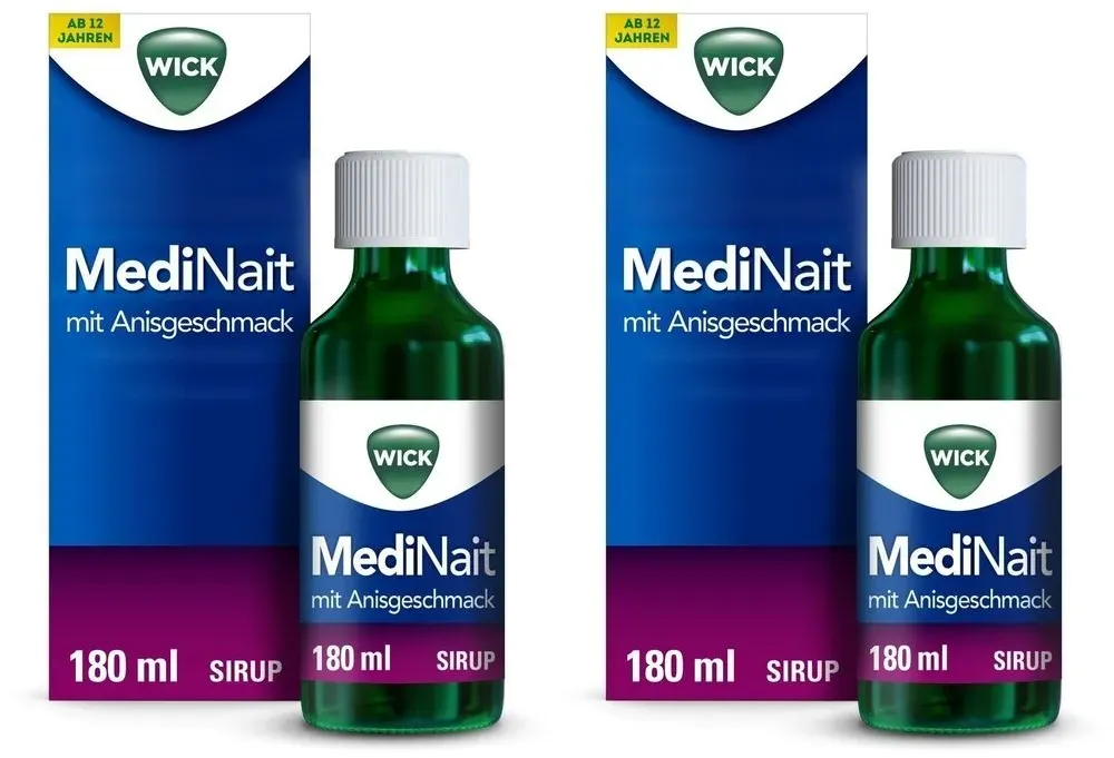 Verfügbarkeit: Sofort lieferbar, 1-2 Werktage (versandfertig) - Kategorie: Arzneimittel - WICK - GTIN:4260398072973 - PZN:81005048 - WICK MediNait Erkältungssirup für die Nacht - DOPPELPACK 2X180 ml - 29,46 Euro bei medikamente-per-klick.de - gefunden von billiger.de Dies ist ein günstiges Doppelpack von Wick MediNait mit Anisgeschmack (2x180 ml) von einem Apotheken-Anbieter. ![]() ![]() Wick MediNait mit Anisgeschmack Sirup 2x 2x180 ml