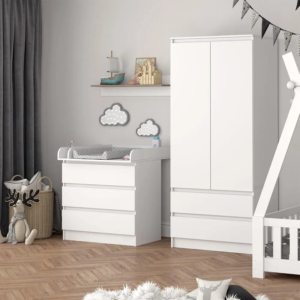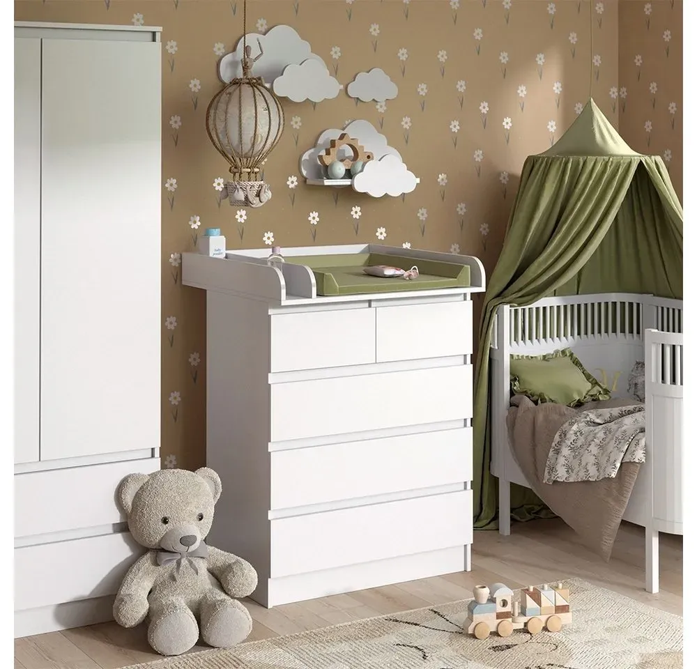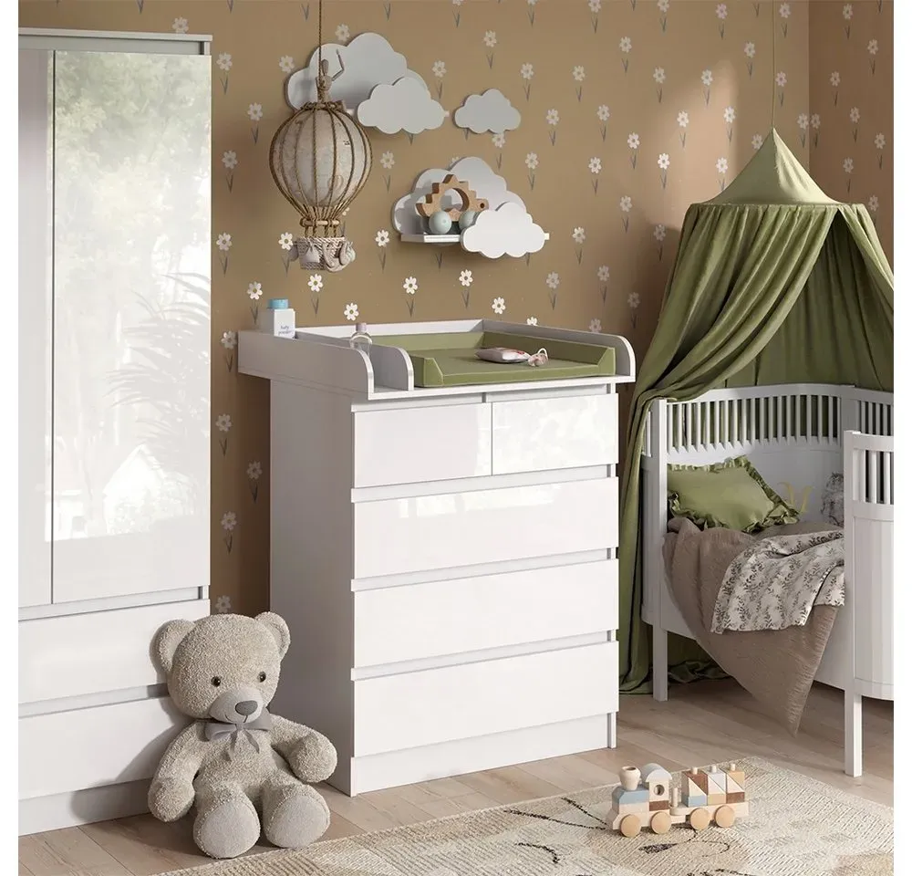 Kommode Wohnen Babymöbel Wickelkommoden Wickeltische Aufbewahrung - EAN:4066731466566 - Ein stilvoller Wickeltisch für jede Wohnung - 'Emma' ist eine gute Entscheidung für frischgebackene Eltern! Die Kommode mit Wickelaufsatz verfügt über 5 Schubladen. Wenn das Kind größer ist, kann sie als normale Kommode verwendet werden. MAßE: Der Baby-Wickeltisch hat eine Tiefe von 76 cm, eine Breite von 80 cm und eine Höhe von 110,2 cm. Die detaillierten Größenangaben finden Sie auf den Fotos. MATERIAL: Die Kommode besteht aus pflegeleichter Spanplatte 16 mm, mit einer Melaminharzbeschichtung. LIEFERUMFANG: Wickelkommode (Dekoration und Wickelauflage nicht im Lieferumfang enthalten), Montageanleitung, Montagematerial Die Wickelkommode Emma ist ein funktionaler und stilvoller Begleiter für jede Familie mit Baby. Durch den Wickelaufsatz, der auf die Kommode aufgesetzt werden kann, verwandelt sich diese in einen praktischen Wickeltisch, der perfekt für das schnelle und einfache Wickeln des Babys ist. Aber das Beste daran: Wenn das Kind erwachsen wird, kann die Kommode einfach - gefunden von Kelkoo Die Wickelkommode in WeiÃ?/WeiÃ? Hochglanz von OTTO ist eine elegante Option für ein modernes Kinderzimmer. ![]() ![]()