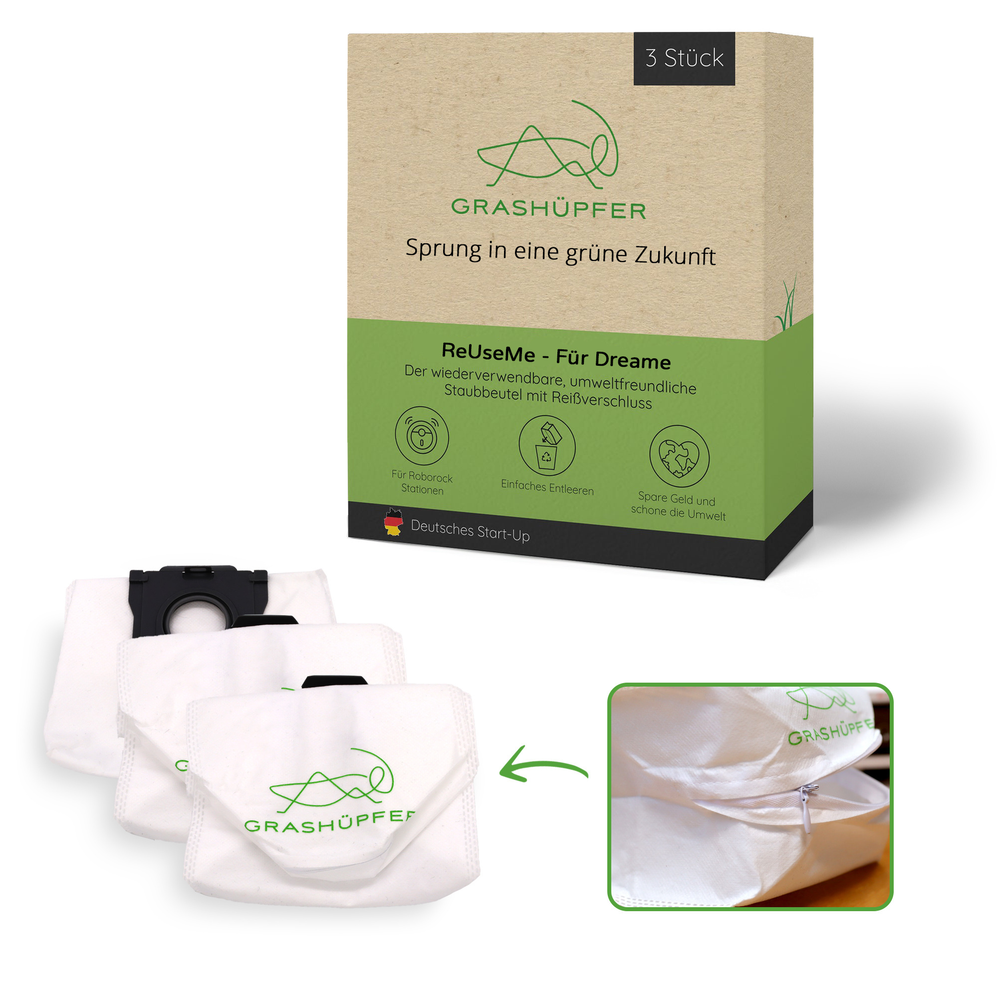 Auf Lager Versand durch AmazonWiederverwendbare Staubbeutel (3 Stück) für Roborock Qrevo, Saros und Curv Serien, sowie Saros 10, 10R, Z70 I GRASHÜPFER®
