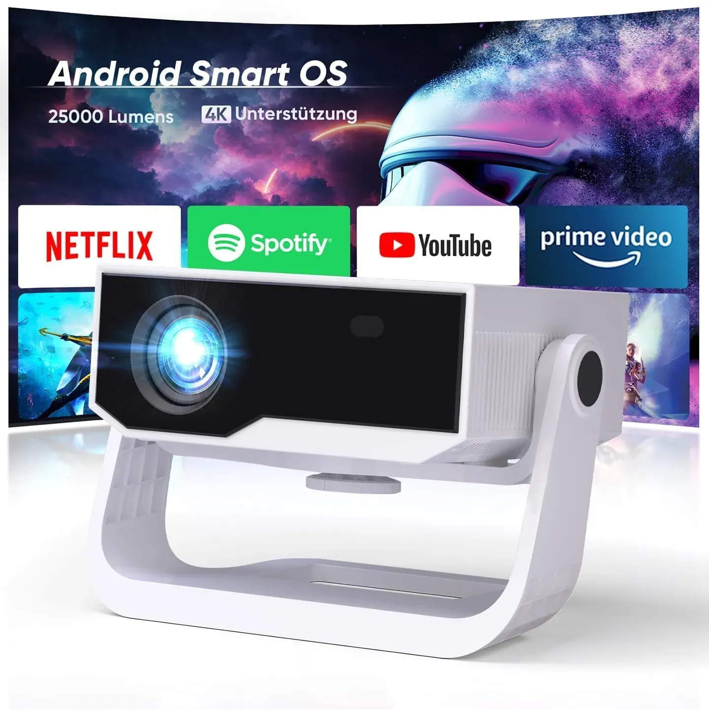 Auf Lager Versand durch Amazon2025 Neuer Smart Beamer 4K Unterstützung, Android 11, Full HD 1080P, 25000 Lumens, WiFi 6 & BT 5.2, 120° Verstellbarer Ständer, Elektrischer Fokus, Trapezkorrektur, Heimkino Beamer