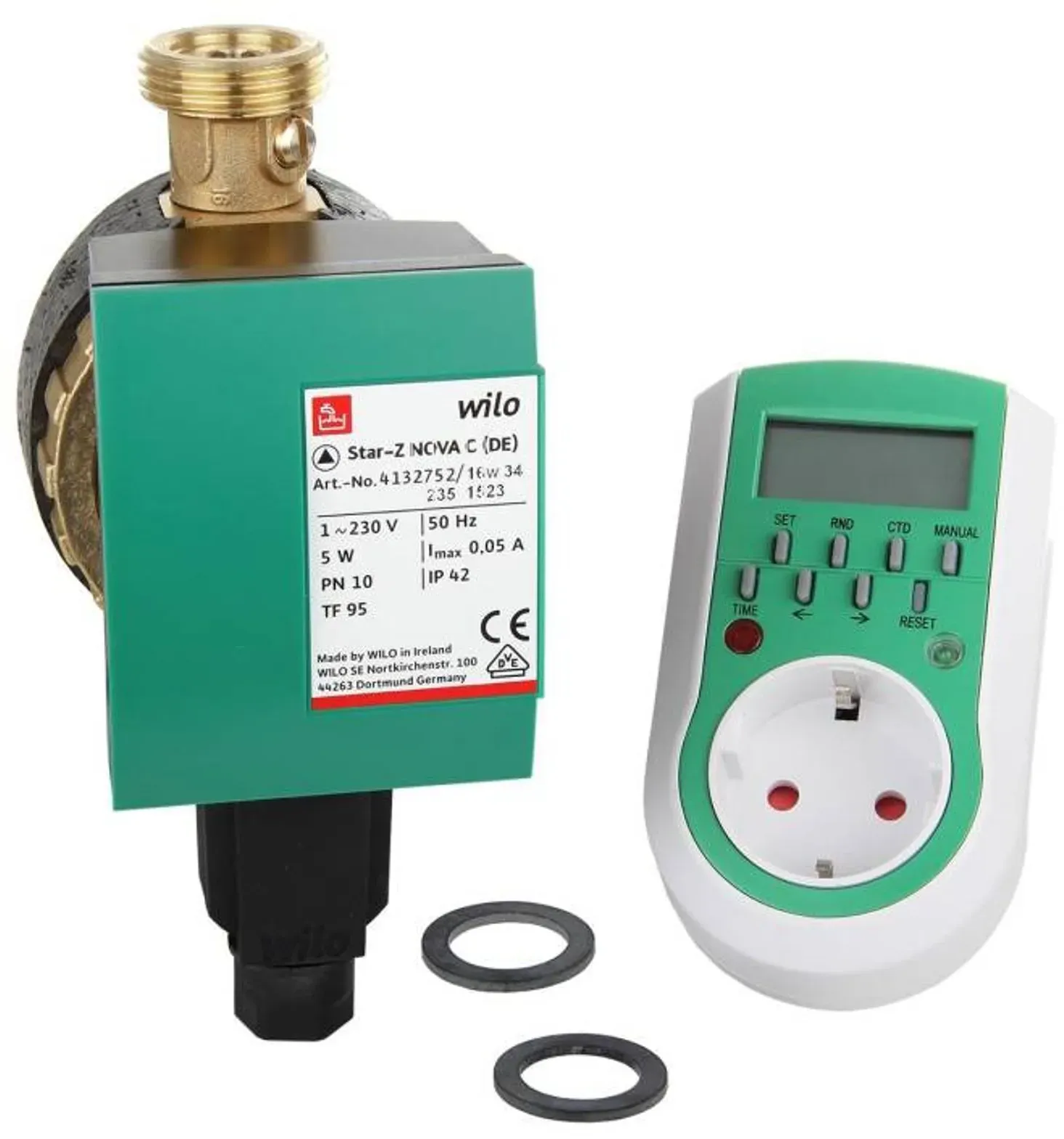 Kategorie: Heizungspumpen - WILO - GTIN:4048482074757 - Trinkwarmwasser-Zirkulationspumpe Wilo Star-Z Nova C Trinkwarmwasser-Zirkulationspumpe Wilo-Star-Z NOVA C (Nassläufer-Ausführung) für das Einfamilienhaus. Pumpe für Rohreinbau, blockierstromfester Synchronmotor mit hohem Anlaufdrehmoment. Messing-Pumpengehäuse, Kunststofflaufrad, Edelstahl-Welle. Einsetzbar für Trinkwasseranwendungen bis Härtegrad max. 20 dH. Leistungsaufnahme von 3 - 5 W. Serienmäßig mit Wärmedämmschale, Gehäuse-Gewinde Rp 1 2.Inklusive Kugelabsperr- und Rückschlagventil mit Gewinde G1', 1,8 m Netzanschlusskabel und digitaler Steckerzeitschaltuhr. Serienmäßig mit: Extrem niedrige Leistungsaufnahme: 3 bis 5 Watt durch neuen Synchronmotor Hochwertigste Materialien Erweiterter Einsatzbereich bei kalkhaltigem Wasser: bis zu 20 dH Flexibler Servicemotor: Schneller Austausch aller gängigen Pumpentypen Schneller Elektroanschluss durch den Wilo-Connector Kugelabsperrventil, Rückschlagventil und digitaler Steckerzeitschaltuhr Achtung: Eine Verschraubung zum Anschluss der Pumpe ist nicht im Lieferumfang enthalten. Diese finden Sie unter dem 'Punkt Zur Auswahl passt' oder in der KategoriePumpenverschraubungen. Bild dient zur Veranschaulichung und kann vom Original abweichen. - 219,90 Euro bei Selfio - gefunden von billiger.de Manomano.d e
