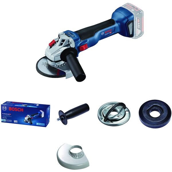 Polierer Werkzeug Fräsen, Schleifen, Trennen Winkelschleifer Elektrowerkzeuge - EAN:4053423323269 - Der Akku-Winkelschleifer GWS 18V-11 S Professional von Bosch bietet dank des bürstenlosen Motors die gleiche starke Leistung wie ein kabelgebundener Winkelschleifer mit 1.100 Watt. Der Handgriff ist links und rechts einsetzbar, und die Schutzhaube ist schnell und ohne Werkzeug verstellbar. Während der Arbeit sorgen der Anti-Vibrationshandgriff, der seitliche arretierbare Schalter, der Sanftanlauf, das geringe Gewicht und ein schlankerer, längerer Griff für mehr Komfort und weniger Ermüdung, während zahlreiche Sicherheitsfunktionen das Verletzungsrisiko senken. Mit dem Stellrad zur Drehzahlvorwahl kann die benötigte Drehzahl auch während des Betriebes in sechs Stufen vorgewählt werden. Der GWS 18V-11 S Professional wurde für eine Vielzahl von leichten bis mittelschweren Trenn- und Schleifaufgaben entwickelt und ist ein vielseitiger Allrounder, der für Wartungs- und Reparaturarbeiten sowie für Installationsarbeiten auf der Baustelle geeignet ist. Er eignet sich zum Trennen, Bürsten und Schruppen von Metall, Kunststoff und Verbundwerkstoffen, zum Trennen und Bürsten von Stein und Beton, zum Schneiden von Armierungseisen, Metallblech, PVC und Fliesen oder zum Entgraten von leichtem Metall, sowie zum Bohren in Stein mit Diamant-Bohrkronen. Die benötigten Akkus sind Teil der AMPShare Alliance, dem markenübergreifenden Akku-System für Profis in Handwerk und Industrie. Ein einziger ... Für 160.64 Euro erhalten Sie ein 18V Solo-Gerät mit Zubehör, das eine gute Leistung für den Preis bietet. ![]() BOSCH Akku-Winkelschleifer »GWS 18V-10« 18.0 V Sologerät, Zubehör blau