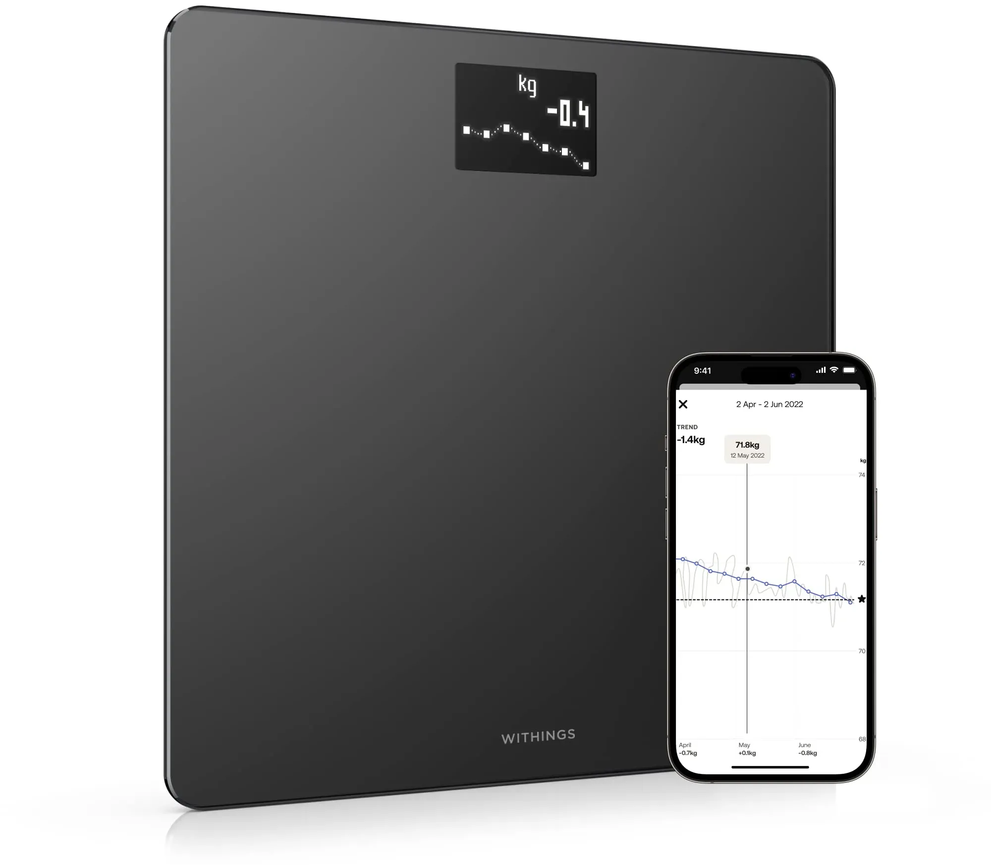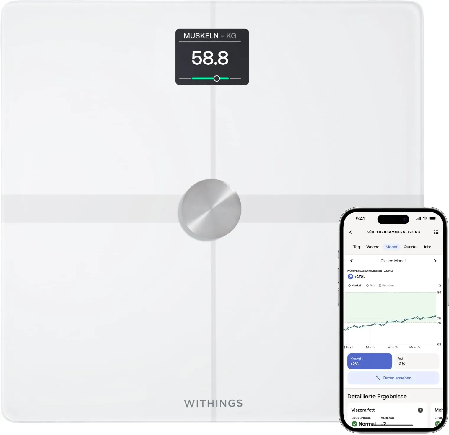 Zustand: Gebraucht - Körperanalysewaagen - Withings - WBS05-White-All-Inter-cr - EAN: 0723548599927 - EIN KLINISCHER SCAN IHRER GESUNDHEIT - Body Smart wurde in Zusammenarbeit mit führenden Krankenhäusern und klinischen Einrichtungen entwickelt und ist klinisch validiert. ERREICHEN SIE IHRE FITNESSZIELE SCHNELLER - Messen Sie Ihr Gewicht zuverlässig mit einer Genauigkeit von 50 g und sehen Sie Ihre Gewichtsentwicklung direkt auf dem hochauflösenden Farbbildschirm der Waage. RAPIDER AUFBAU VON MUSKELMASSE - Bauen Sie schneller Muskelmasse anhand der Analyse Ihrer Körperzusammensetzung auf, um Ihre Bemühungen anzupassen. FOLGEN SIE IHREM HERZEN - Messen Sie bei jedem Wiegen Ihre Herzfrequenz, ein guter Indikator für die allgemeine Herz-Kreislauf-Fitness. STOFFWECHSEL ANKURBELN - Regen Sie Ihren Stoffwechsel an, indem Sie den täglichen Energiebedarf Ihres Körpers ermitteln. ERFINDER DER INTELLIGENTEN WAAGE - Genießen Sie ein leistungsstarkes Erlebnis mit der kostenfreien und hoch bewerteten App (4,5/5), nahtlose Datensynchronisierung über WLAN, ein Farbdisplay mit hoher Lesbarkeit und eine einjährige Akkulaufzeit ohne Aufladen. LIEFERUMFANG - Body Smart, Microzellen (AAA), Teppichfüße, Bedienungsanleitung, Kurzanleitung - Verkäufer: Withings DE im amazon.de Marketplace Eine Withings Body Smart Black zu einem wettbewerbsfähigen Preis von einem bekannten Händler. ![]() ![]() WITHINGS Body Smart Black, Körperanalysewaage