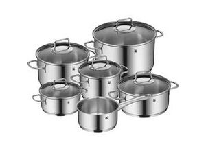 Zustand: Neu - Topfsets - WMF - 3201113640 - EAN: 4000530749307 - Inhalt: 1x niedriger Kochtopf mit Deckel 20 cm (V 2,5l), 2x hoher Kochtopf 16 cm (V 1,9l), 24 cm (V 5,7l), 1x Stielkasserolle ohne Deckel 16 cm (V 1,5l) - Artikelnummer: 0780546040 Material: Cromargan Edelstahl Rostfrei 18/10, poliert, unbeschichtet, rostbeständig, spülmaschinenfest, hitzebeständig und backofenfest bis 250°C (mit Deckel 180°C) Glas Die krustfreien Töpfe können auf allen gängigen Herdarten verwendet werden: Induktionsherd, Gasherd, Elektroherd, Glaskeramikherd. Durch die optimale Hitzeverteilung brennt nichts an. Die genieteten Griffe des Edelstahl-Topfs sorgen für einen sicheren Halt und werden beim Kochen nicht heiß. Der Glasdeckel ohne Dampföffnung ermöglicht die Beobachtung des Kochvorgangs. Die Bodenkonstruktion sorgt für eine gleichmäßige und dauerhafte Wärmespeicherung. Das spart Energie und Zeit beim Kochen. - Verkäufer: Möbel Jack im amazon.de Marketplace ![]() WMF Kochtopfset Astoria, Edelstahl, Metall, 5-teilig, 20 cm,16 cm, TransTherm®-Allherdboden, Kochen, Töpfe, Topfsets