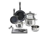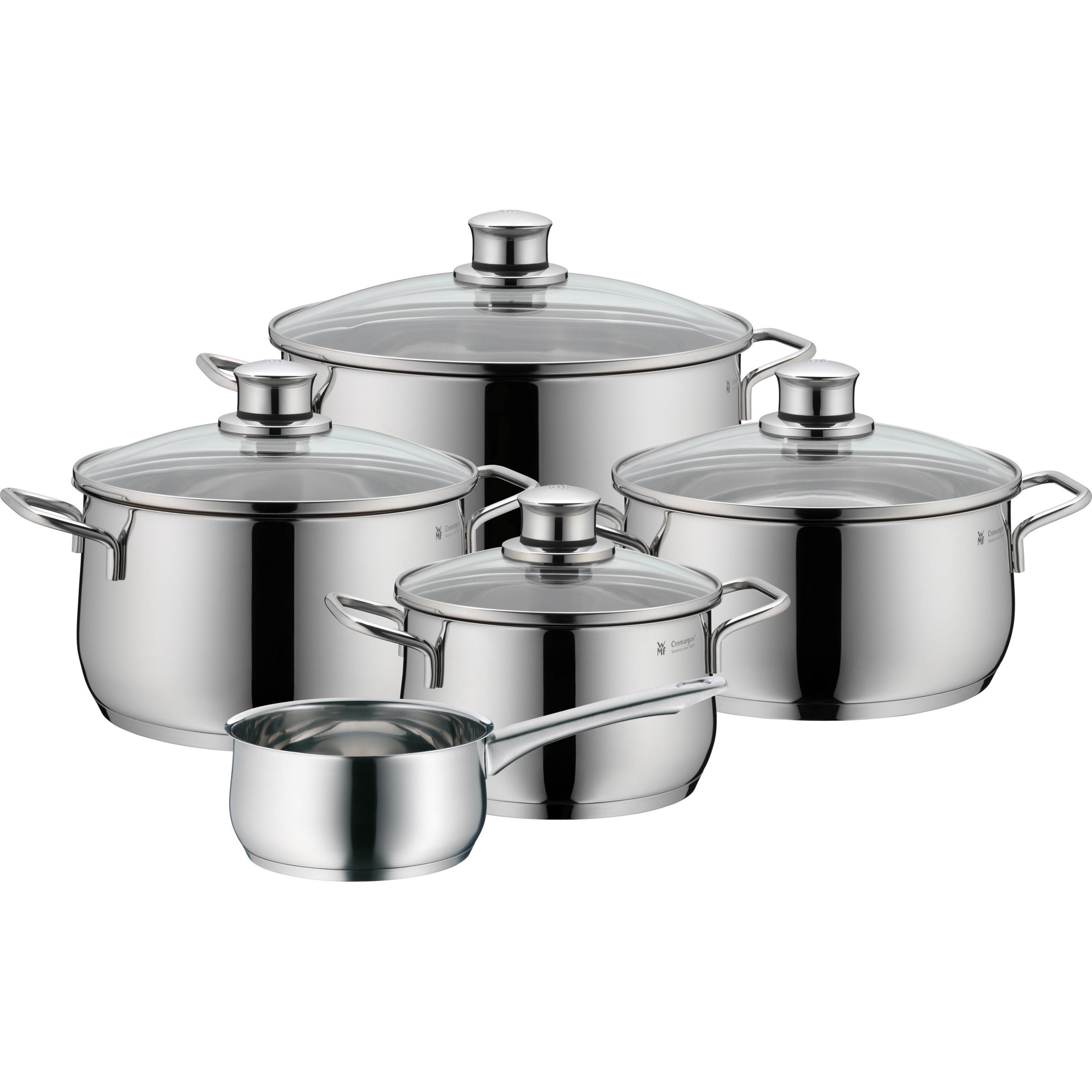 Kategorie: Töpfe - WMF - GTIN:4000530570734 - Inhalt: 1x Bratentopf mit Deckel 20 cm (V 3,0l), 3x Fleischtopf mit Deckel 16 cm (V 2,0l), 20 cm (V 3,7l), 24 cm (V 6,5l) - Artikelnummer: 0730046040 Material: Cromargan Edelstahl 18/10, poliert, unbeschichtet - rostfrei, spülmaschinengeeignet, hitzebeständig und backofengeeignet bis 250°C (mit Deckel 180°C). Glas Die Töpfe ohne Skalierung können auf allen gängigen Herdarten verwendet werden: Induktionsherd, Gasherd, Elektroherd, Glaskeramikherd. Dank der optimalen Wärmeverteilung brennt nichts an Die genieteten Griffe des Edelstahl-Kochtopfs bieten einen sicheren Halt und werden während dem Kochvorgang nicht heiß. Der Glasdeckel ohne Dampföffnung ermöglicht es den Garvorgang zu beobachten Die Bodenkonstruktion sorgt für eine gleichmäßige und lange Wärmespeicherung. So kann während dem Kochen Energie und Zeit gespart werden - 119,99 Euro bei Amazon Marketplace Home - gefunden von billiger.de Dieses 5-teilige Set ist eine preiswerte Option für alle, die ein komplettes Set suchen. ![]() ![]() WMF Diadem - Plus 5-teilig eBay Topf-Set - Edelstahl