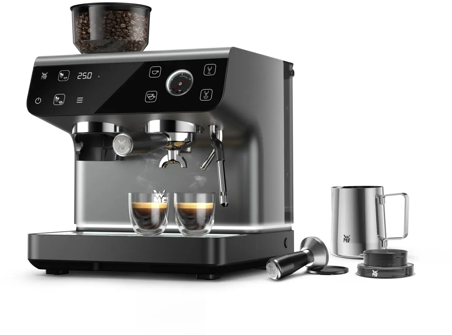 WMF - EAN: 4211129228237 - Den perfekten, exakt auf die eigenen Vorlieben abgestimmten Espresso zu Hause zubereiten meisterhaft und mit Leichtigkeit. Die WMF Espresso Pro Siebträgermaschine mit integriertem Mahlwerk, präziser Kaffeewaage und intuitivem Touch-Display vereint Komfort und Kontrolle auf höchstem Niveau. Dank der Möglichkeit, 60 unterschiedliche Mahlgrade sowie Kaffeemenge, Brühdruck, Brühtemperatur, Vorbrüh- und Extraktionszeit individuell zu justieren, bietet sie volle Flexibilität bei der Zubereitung und übernimmt dabei technisch genau jene Schritte, die entlasten. Das Tampen und Milchaufschäumen bleibt dem Handwerk des Home-Baristas vorbehalten genau dort, wo es auf echte Perfektion ankommt. So gelingt eine optimale Aroma-Extraktion, ganz nach persönlichem Geschmack Tasse für Tasse, mit dem gewünschten Aroma, Charakter und perfekter Crema. Auch Cappuccino & Co gelingen im Handumdrehen: Die WMF Doppel-Thermoblock Technologie mit zwei Heizkreisläufen erhitzt Wasser und Milch getrennt und punktgenau auf die jeweils ideale Temperatur für feinporigen Milchschaum und besten Kaffeegenuss wie vom Barista. - bei wmf.com - aus Yadore Produktdaten ![]() WMF Espresso Pro Siebträgermaschine