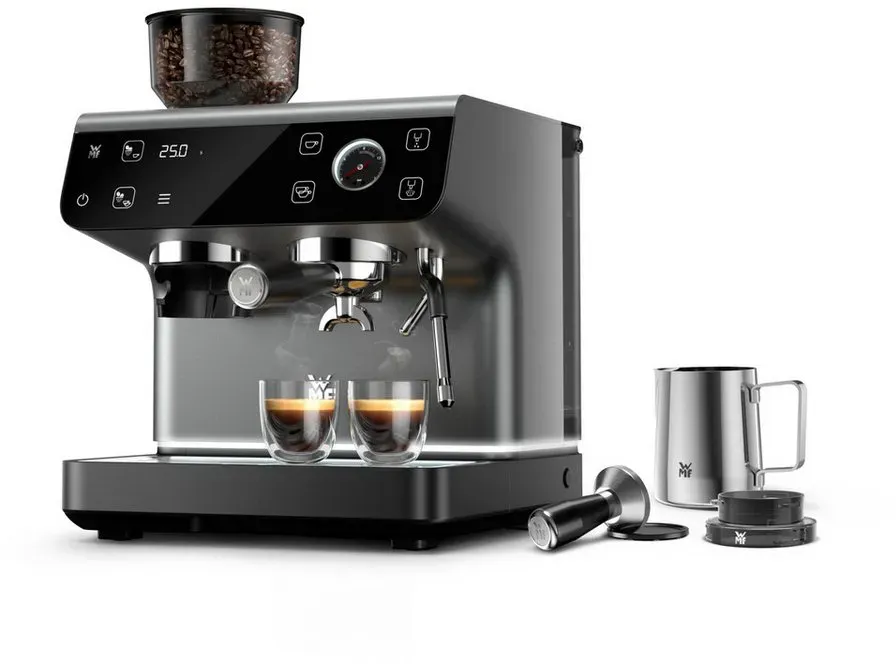 6 Händlerangebote bei billiger.de - Kategorie: Espressomaschinen - WMF - Die WMF Espresso Pro vereint meisterhafte Technik mit intuitiver Bedienung €“ für echten Kaffeegenuss, exakt abgestimmt auf Ihre Vorlieben. Ob kräftiger Espresso, cremiger Cappuccino oder vollmundiger Latte Macchiato: Diese Siebträgermaschine bringt professionelle Qualität in Ihre Küche. Dank integriertem Mahlwerk, präziser Kaffeewaage und intelligentem Touch-Display steuern Sie alle Parameter bequem und präzise. Wählen Sie aus 60 Mahlgraden und passen Sie Kaffeemenge, Brühtemperatur, Brühdruck, Vorbrühzeit und Extraktionszeit individuell an €“ für jede Tasse mit genau dem Charakter, Aroma und der Crema, die Sie lieben. Während die WMF Espresso Pro die technischen Feinheiten übernimmt, bleibt das Herzstück des Barista-Handwerks €“ das manuelle Tampen und Milchaufschäumen €“ bewusst in Ihrer Hand. So kombinieren Sie höchste Kontrolle mit echter Handwerkskunst. Für Cappuccino & Co sorgt die WMF Doppel-Thermoblock-Technologie mit zwei separaten Heizkreisläufen. Diese erhitzen Wasser und Milch punktgenau auf die ideale Temperatur €“ für samtig-feinporigen Milchschaum und perfekten Geschmack. Espressogenuss wie vom Profi €“ individuell, komfortabel, vollendet. Probieren Sie es aus: Mit der WMF Espresso Pro gelingt meisterhafter Kaffee €“ Tasse für Tasse. - GTIN:4211129228237 ![]() ![]() WMF Espresso Pro Siebträgermaschine Stone Grey