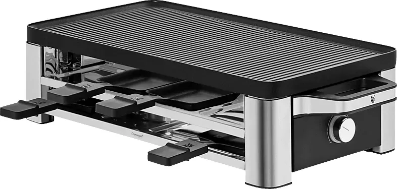 Auf Lager Versand durch AmazonWMF Master Raclette Grill mit Keramikpfännchen und Schiebern, Raclette 8 Personen, 1500 W, mit Ablage, variable Temperaturkontrolle, antihaftbeschichtet, spülmaschinengeeignet, edelstahl schwarz matt