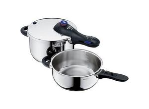 4 Händlerangebote bei billiger.de - Kategorie: Schnellkochtöpfe - WMF - Inhalt: 1x Dampf-/ Druckkochtopf ohne Einsatz (V 6,5l, Ø 22 cm) mit Deckel und Dichtungsring, 1x Schnellbratpfanne (V 3l, Ø 22 cm) ohne Deckel - Artikelnummer: 0794469990 (Modell 2022) Material: Cromargan Edelstahl 18/10 Rostfrei für außergewöhnliche Haltbarkeit und Hygiene, spülmaschinengeeignet. Kunststoff. Dichtungsring und abnehmbarer Deckelgriff sind NICHT spülmaschinengeeignet Der Drucktopf mit Flammschutz ist für allen Herdarten geeignet - auch Induktion. Der TransTherm-Boden spart dank seiner optimalen Wärmespeicherung Energie während des Kochens. Messskala für einfaches Abmessen Einfache Bedienung durch extragroßes Kochsignal, 2-Stufen-Garregler (Schonstufe 110°C für Gemüse, Fisch; Intensivstufe 119°C für Fleisch, Kartoffeln, Eintöpfe) und integriertem soften Dampfablass Extrasicher: 5-stufiges, TüV-geprüfte Sicherheitssystem mit Abdampfautomatik. Der kleine Pin ist eine sichtbare Restdruckanzeige und lässt den Topf erst öffnen, wenn er komplett verschwunden ist - GTIN:4000530725189 Dieses 3-teilige Set mit 6,5L und 3L Töpfen bietet eine vielseitige Lösung für größere Familien oder wenn Sie oft für Gäste kochen. ![]()