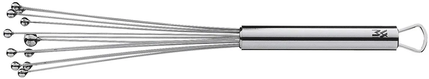 17 Händlerangebote bei billiger.de - Kategorie: Schneebesen - WMF - Inhalt: 1x Schneebesen mit Edelstahl-Kugeln (Länge 27 cm) - Artikelnummer: 1872319990 Material: Cromargan Edelstahl 18/10, teilmattiert. Rostfrei, spülmaschinengeeignet, formstabil, hygienisch, säurefest und unverwüstlich Die flexiblen Drähte erreichen den äußersten Rand in Töpfen / Schüsseln. Dank der großen Aufschlagfläche der Kugeln kann am Topfboden nichts anhaften. Die Funktionsteile sind fest im Griff eingefasst Das Anrühren und Aufschlagen von Suppen/ Cremes gelingt in Sekunden: durch die schwingenden Kugeln gelangt sehr viel Luft unter die Rührmasse Zwischen den Drähten bleibt nichts hängen, dadurch ist der Rührblitz leicht zu reinigen und hygienisch. Mit praktischer öse zur Aufbewahrung an einer Hängeleiste mit Haken - GTIN:4000530550859 ![]() ![]() WMF Profi Plus Rührblitz 27 cm, Schneebesen Edelstahl -Kugeln, Cromargan Edelstahl teilmattiert, Rührbesen, Quirl