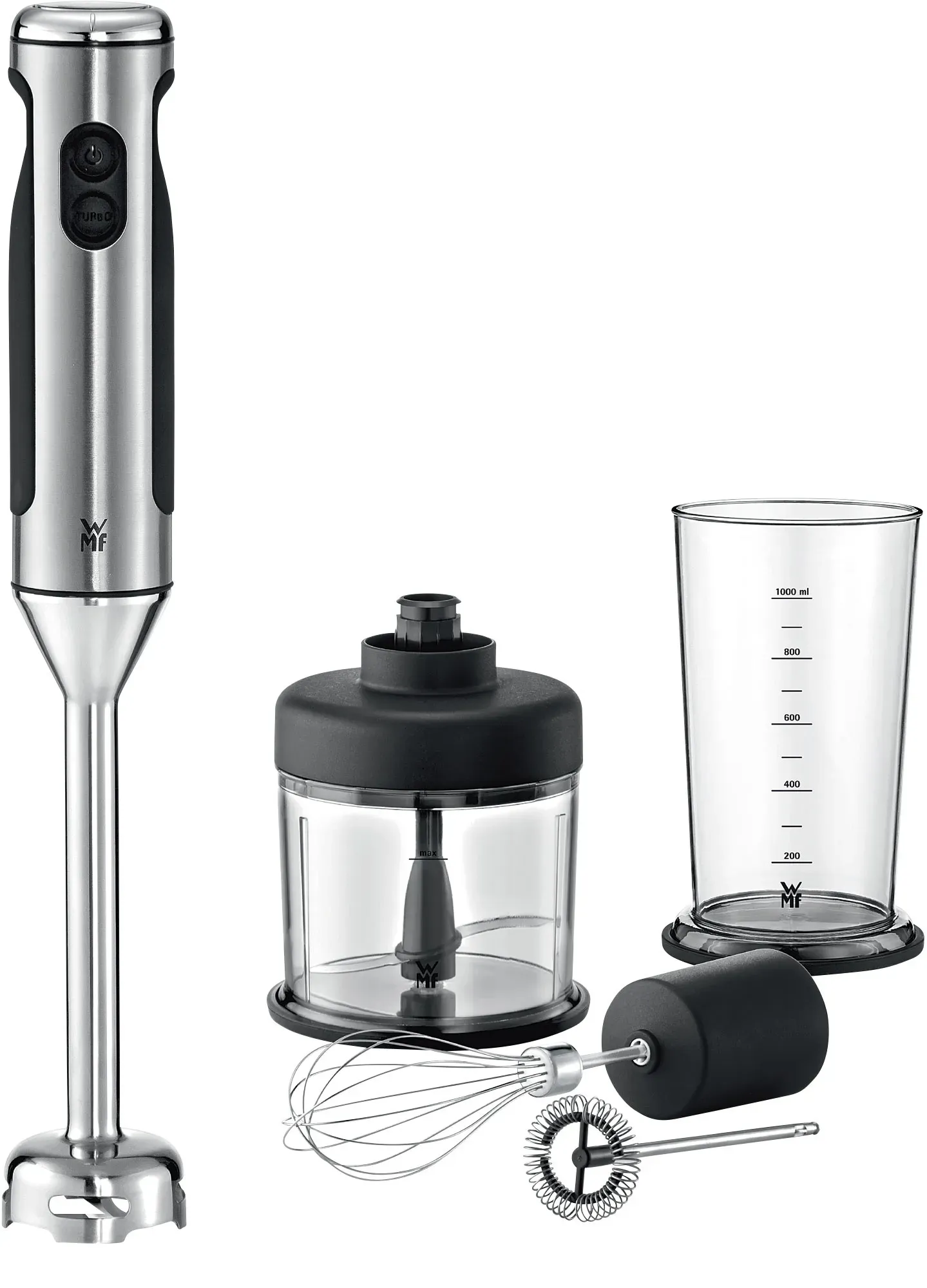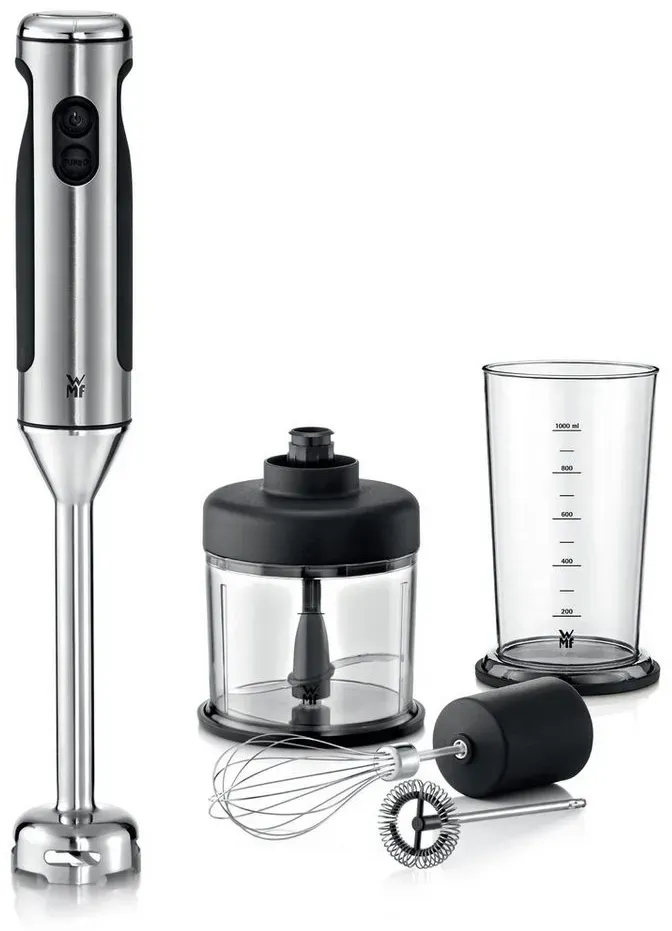 WMF - EAN: 4211129116381 - WMF Lineo Stabmixer Set, 5-teilig, mit Pürierstab, Schneebesen, Milchaufschäumer, Zerkleinerer, 700 Watt, inklusive 1 l Mixbehälter, mattes Edelstahl - Inhalt: 1x Stabmixer aus Cromargan Edelstahl (7 x 7 x 42 cm, 700 Watt, Kabellänge 1,4 m), 1x Schneebesen, 1x Milchaufschäumer, 1x Zerkleinerer, 1x Mixbehälter (1 l) mit Skalierung - Leistung: 700 Watt, 13.000 U/min, 125 km/h, variable Geschwindigkeitseinstellung und Turbo-Funktion für maximale Leistung - Ergonomischer Anti-Rutsch-Griff für maximalen Komfort und Sicherheit; der Cromargan Pürierstab ist abnehmbar und spülmaschinengeeignet - WMF 2+2 Messertechnologie: 2-flügliges Edelstahlmesser, herausnehmbare Messereinheit - Zubehör-Set mit Mixbehälter (1 l) mit Skala und Anti-Rutsch-Sockel, Schneebesen, Milchaufschäumer und Zerkleinerer mit 600 ml Mixbehälter Als erster Stabmixer mit Cromargan Voll-Edelstahlgehäuse besticht der WMF Edelstab durch seine schlanke Form und vor allem durch seine Technik. Der Pürierstab mit WMF 2+2 Messertechnologie in Kombination mit einem langlebigen 700 Watt Motor sorgt für edle und perfekte Mixergebnisse. Der Lieferumfang beinhaltet einen praktischen 1 Liter Mixbehälter mit Skala und Anti-Rutsch-Sockel. Der WMF Edelstab kann durch das optionale Zubehör-Set, bestehend aus Zerkleinerer, Schneebesen und Milchaufschäumer, zu einer smarten Küchenmaschine erweitert werden. Seit über 16 n lebt die Marke WMF eine starke Tradition. Sie ist international präsent, setzt ... Der WMF Stabmixer LINEO Edelstab 4in1 bietet mit 700W eine starke Leistung und vielseitige Einsatzmöglichkeiten. ![]() ![]()