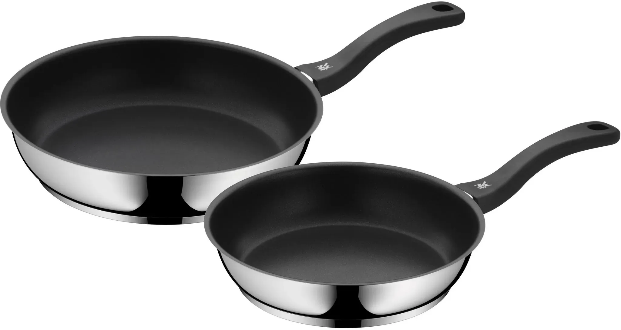 Verfügbarkeit: 1 Werktag - Kategorie: Pfannen - WMF - GTIN:4000530699190 - WMF Devil Pfannenset 2-teilig, Bratpfanne 28 cm + 24 cm, Pfanne Induktion, Cromargan Edelstahl beschichtet, Kunststoffgriff. - Cromargan Edelstahl Rostfrei 18/10. PTFE-Antihaftbeschichtung. Fettarmes, gesundheitsbewusstes Braten ohne Ankleben. Hitzebeständig bis 260°C, backofenfest bis 70°C. - Die Bratpfannen können auf allen gängigen Herdarten verwendet werden: Induktion, Gasherd, Elektroherd, Glaskeramikherd. Dank der optimalen Wärmeverteilung brennt nichts an-verwendbar für jedes Gericht. - Der Boden (TransTherm) sorgt für eine gleichmässige, lange Wärmespeicherung - ideal zum knusprigen Braten mit wenig Fett. Sicheres Handling durch ergonomischen Kunststoffgriff mit Flammschutz. Die Kollektion Devil umfasst ein vielseitiges Pfannensortiment für jedermann. Eine Aluminium - Pfanne oder eine Pfanne aus dem bekannten Cromargan, Devil - Pfannen sind ein super Einstieg für Hobbyköche. Das Sortiment umfasst grosse und kleine Pfannen, Spezialpfannen wie eine Crepespfanne, aber auch Servierpfannen. Alle Devil - Pfannen sind mit einer Antihaftbeschichtung überzogen. Nicht alle Pfannen der Serie Devil sind induktionsgeeignet.Ob Hobby- oder Profikoch, ob Spiegelei mit Speck oder Haute Cuisine: Der Klassiker unter den Bratpfannen, die Stielpfanne, darf in keiner Küche fehlen. Das Pfannen-Sortiment von WMF bietet für jedes Gericht, jede Zutat und jede Zubereitungsart ein passendes Modell. ... Ein kompaktes 3-teiliges Set, das sich gut für kleine Haushalte oder als Starter-Set eignet. Wmf.com