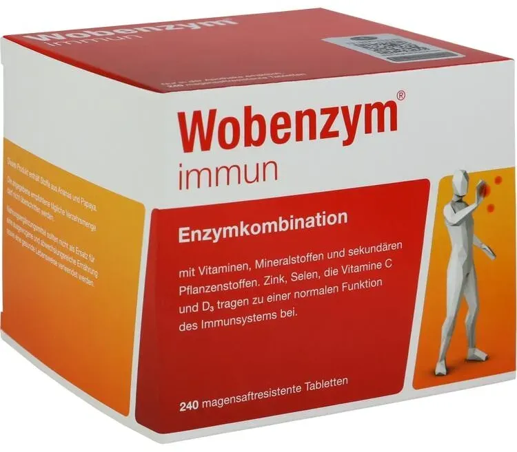 Wobenzym - Anwendungsgebiet von Wobenzym immun magensaftresistente TablettenWobenzym immun magensaftresistente Tabletten sind ein Nahrungsergänzungsmittel zur Unterstützung des Immunsystems. Unser Immunsystem benötigt jeden Tag voll funktionsfähige Immunzellen, um die nötigen Abwehrkräfte zu stärken. Diese Immunzellen wiederum brauchen Enzyme, um Ihre Aufgaben zu erledigen. Wobenzym immun magensaftresistente Tabletten unterstützen genau diese Zellen durch Aktivstoffe und die nötigen Enzyme. Des Weiteren unterstützen Wobenzym immun magensaftresistente Tabletten die Zellen vor oxidativen Schäden zu schützen und spenden ein Mineralstoffkomplex, Vitamine sowie sekundäre Pflanzenstoffe. Wirkstoffe / Inhaltsstoffe / Zutaten1 g von Wobenzym immun magensaftresistente Tabletten enthält: Füllstoff Cellulose beta-Glucane aus Saccharomyces cerevisiae Papain Vitamin C Füllstoff Hydroxypropylcellulose Traubenkern-Extrakt (Polyphenole) Bromelain Quercetin Vitamin E Zinkcitrat Trennmittel Fettsäuren, Magnesiumsalze von Speisefettsäuren und Siliciumdioxid mittelkettige Triglyceride überzugsmittel Natriumalginat Hydroxypropylmethylcellulose, Ethylcellulose, Polydextrose und Talkum Maltodextrin Gelatine Stärke Zucker Farbstoff Titandioxid Aroma Natriumselenit Vitamin D3 Nährwertangaben: pro Tablette // pro Tagesportion (6 Tabletten) // % NRV* Enzyme** Bromelain: 10 mg // 60 mg // - Papain: 45 mg // 270 mg // - Vitamine Vitamin C: 33,3 mg // 200 mg // 250 % Vitamin D3: 1,7 g // 10 g // 200 % ... ![]() ![]() WOBENZYM immun magensaftresistente Tabletten 240 St